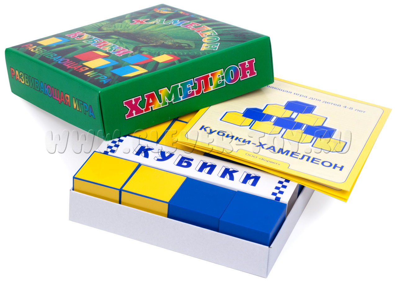 Кубики «Хамелеон» от фирмы «Корвет» незаменимы для формирования у ребёнка пространственных представлений. С их помощью можно создавать сооружения и постройки: башенки, диваны, самолёты, лесенки, домики и т.д. Игра необходима всем детям дошкольного и младшего школьного возраста, особенно тем, у кого недостаточно развито образное мышление и умение осуществлять комбинаторные действия.