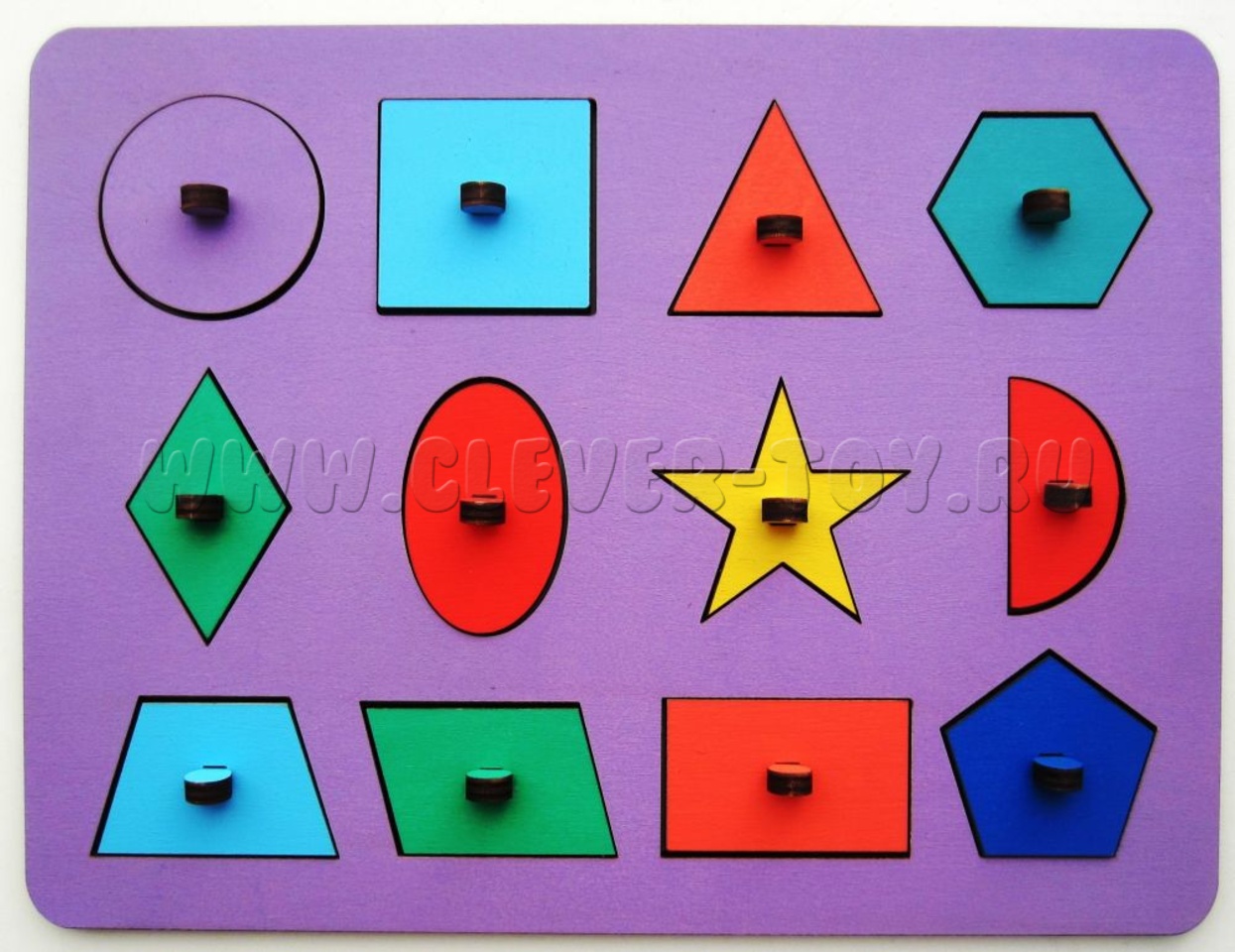 12 основных фигур, с которыми познакомится ребенок: круг, квадрат, трапеция, прямоугольник, треугольник, ромб, параллелограмм, овал, пятиугольник, шестиугольник, звезда, полукруг.