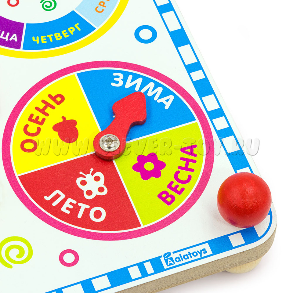 Разделён на 4 сезона: осень – жёлтый, зима – синий, лето – красный, весна – зелёный. В центре круга – вращающаяся стрелка-указатель.