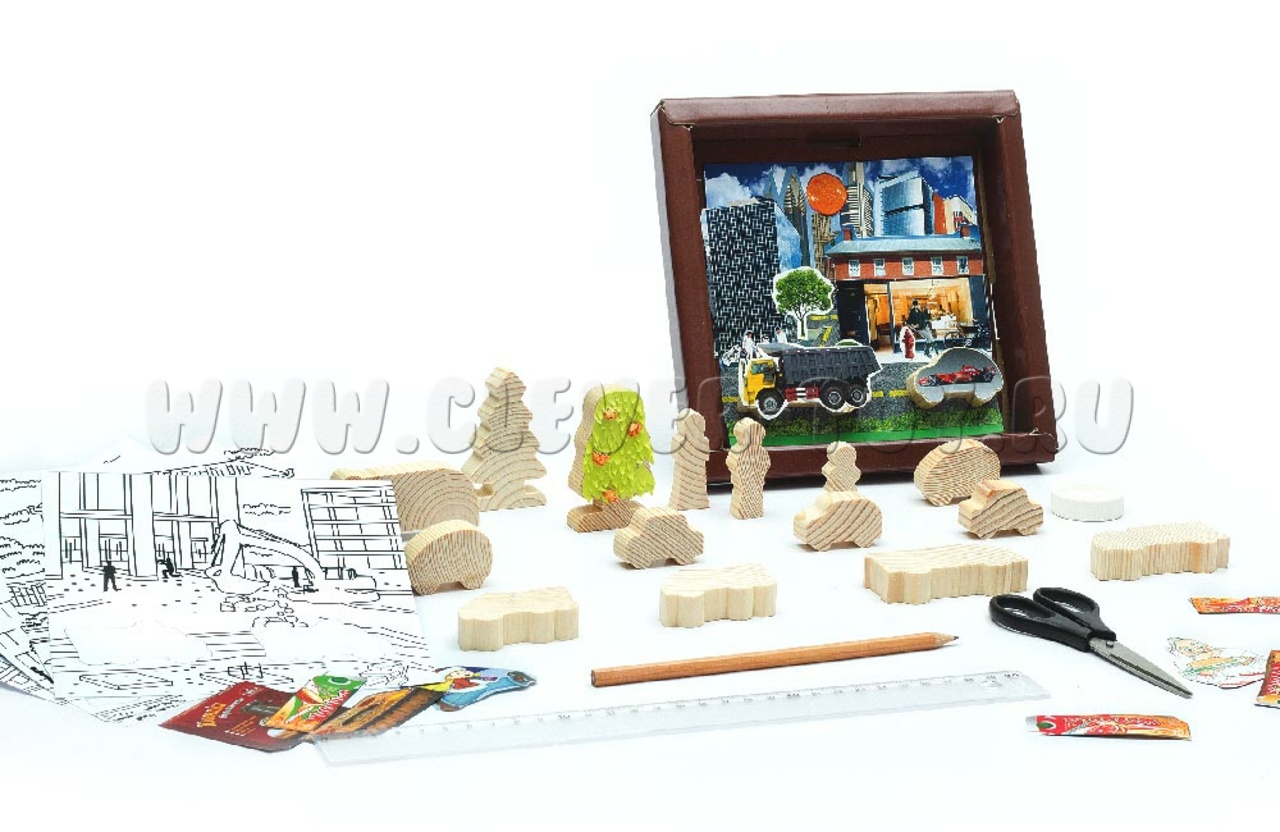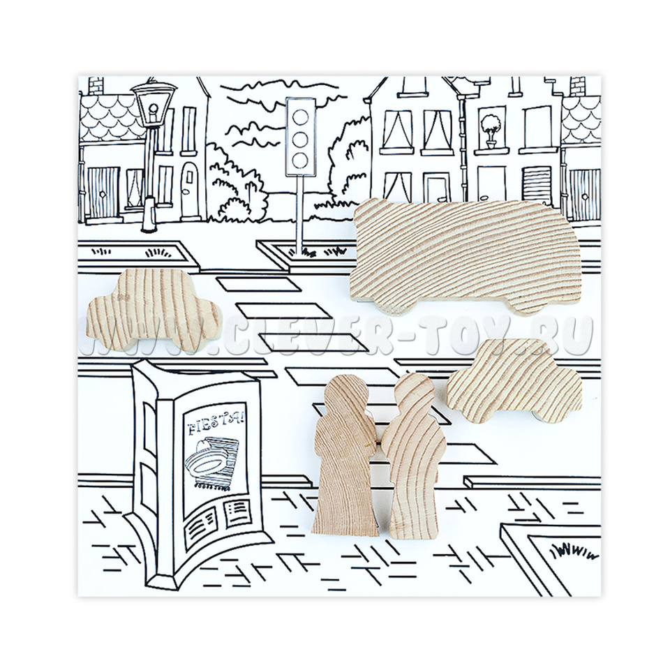 1. Деревянные фигурки автомобилей, деревьев, человесков - 18 деталей;