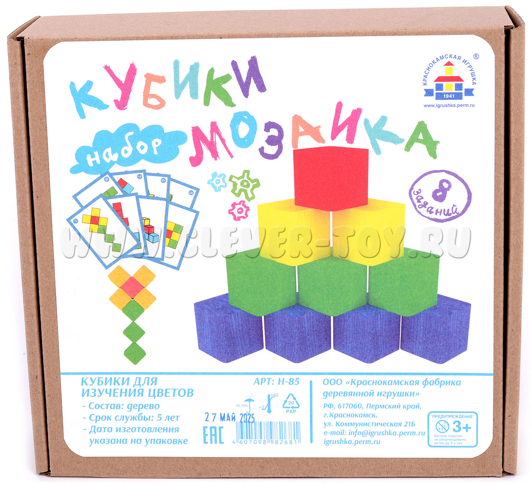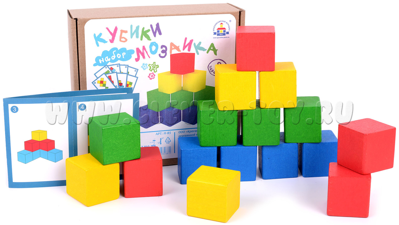 Из деревянных разноцветных кубиков "Мозаика" дети сами смогут придумывать разнообразные фигуры или складывать их по образцам на карточках-заданиях.