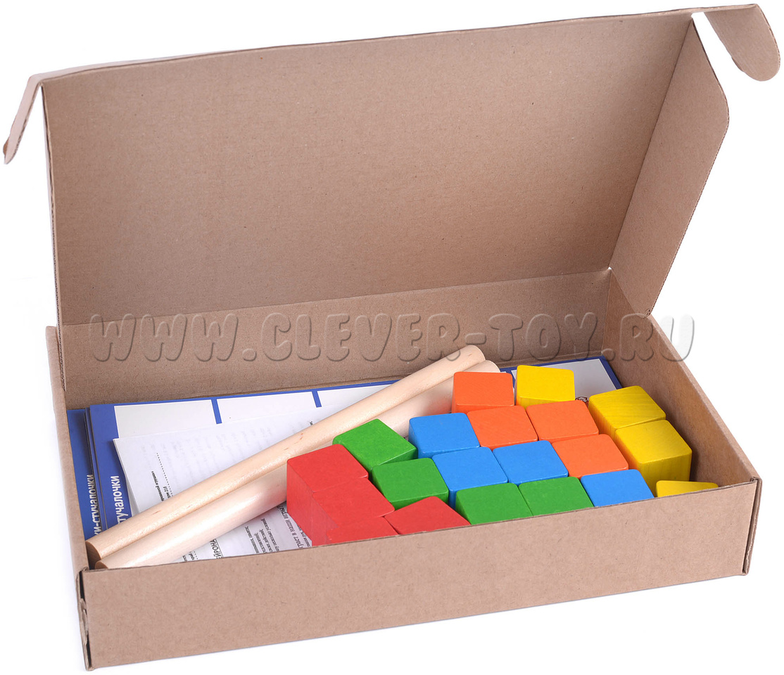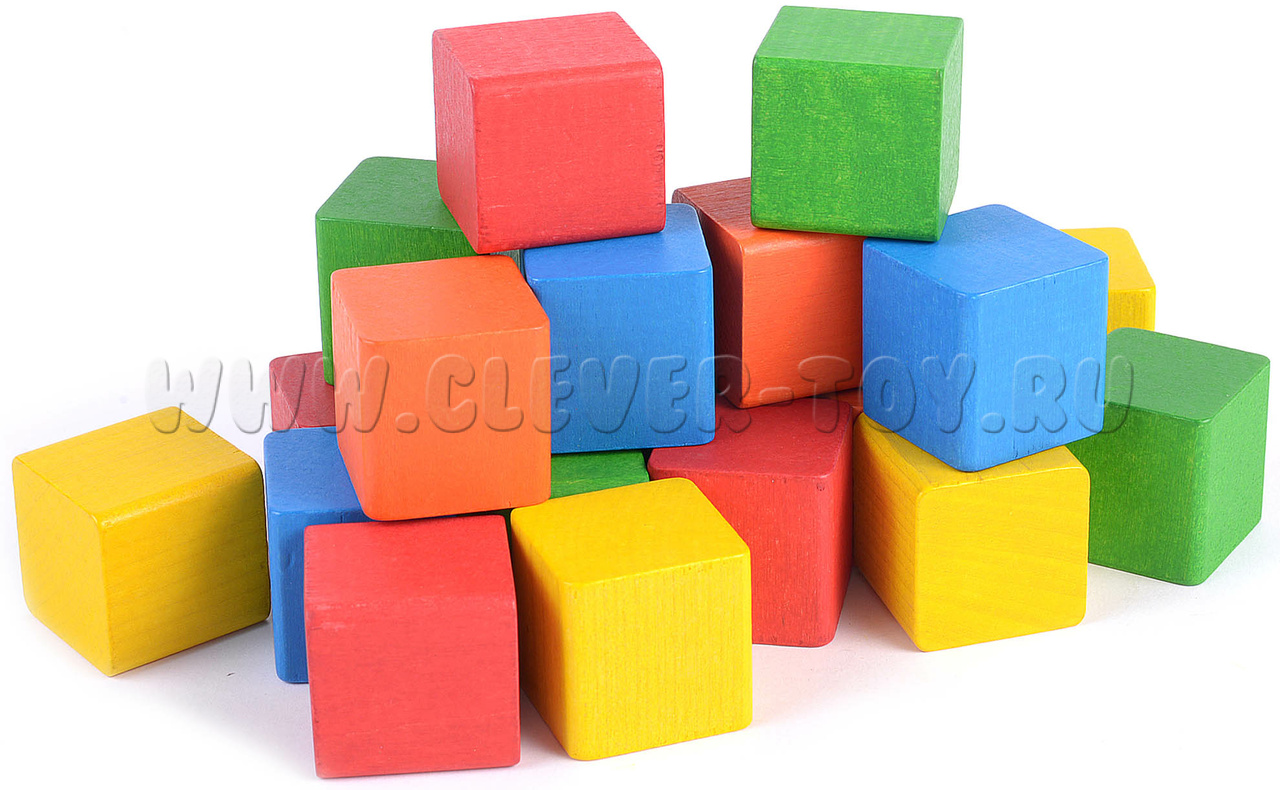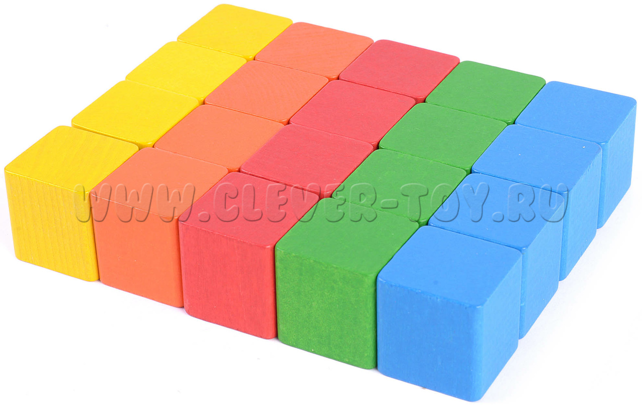 • 20 деревянных кубиков (3х3х3см) 4-х цветов: жёлтый, оранжевый, красный, зелёный, голубой;