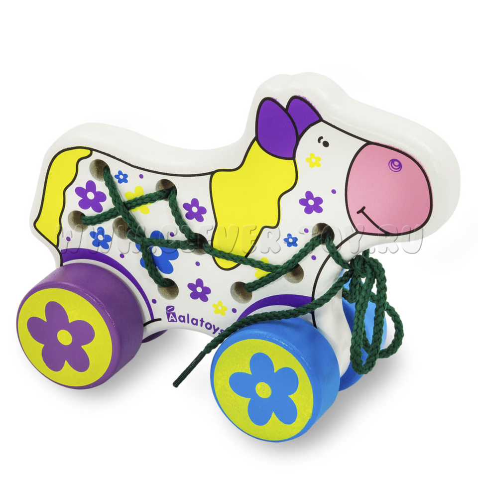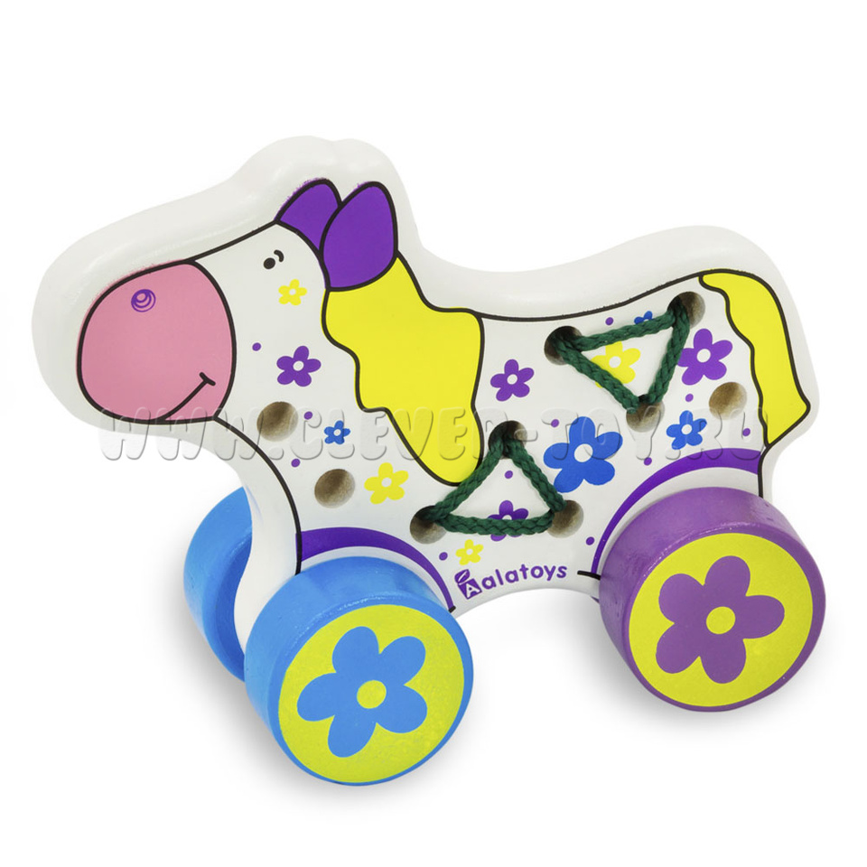 Детская игрушка –каталка в форме милой лошадки отлично подойдет для девочек. "Лошадь" многофункциональна игрушка потому, что содержит вдобавок шнуровку для развития пальчиков. Огромную пользую она принесет детям, у которых трудности в речевом развитии, потому, что развивая моторику рук и пальцев, можно параллельно развивать участок коры головного мозга, отвечающий за формирование речи. Если правильно протянуть шнуровку между дырками, то можно сделать из лошадки – каталку. Таким образом, деревянная лошадка отличная развивающая игрушка для малышей.
