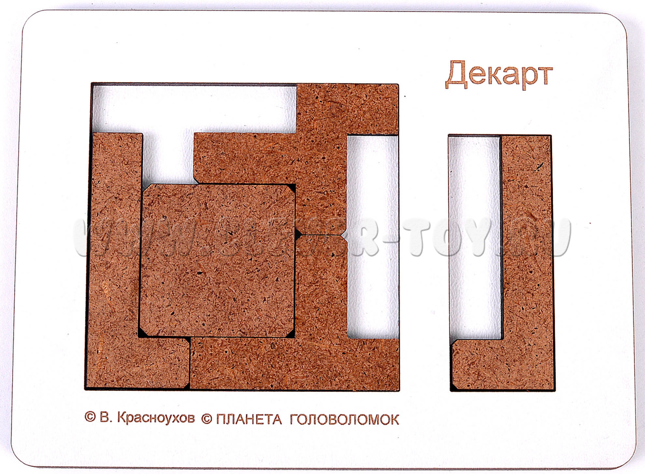 Головоломка "Декарт" состоит из 5 сложных деталей и деревянной рамки. Цель игры - правильно расположить все детали в рамке, чтобы вошли все 5.