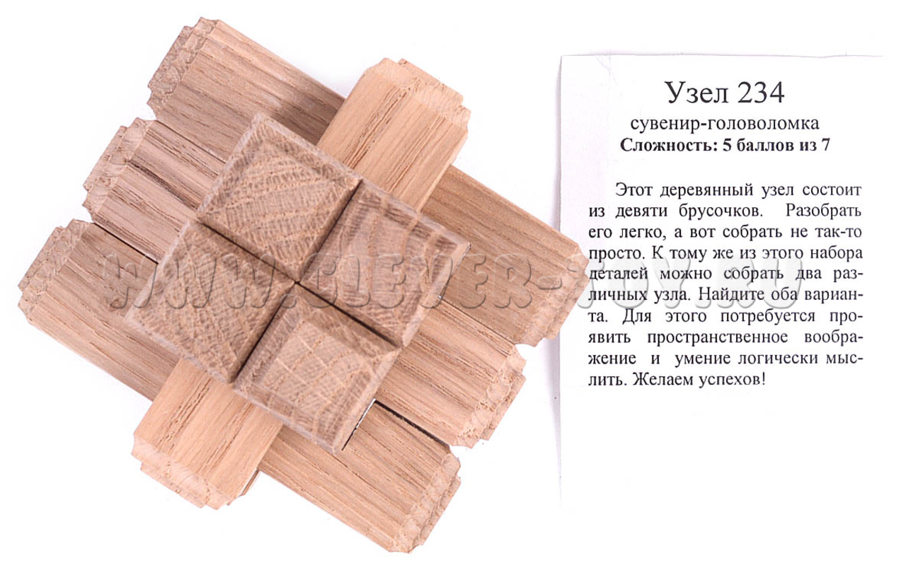 Головоломка “Узел 234” - это уникальная деревянная игра, состоящая из 9 брусочков. Чтобы ее собрать и разобрать, придется потратить не один час и порой даже весь вечер или несколько дней.