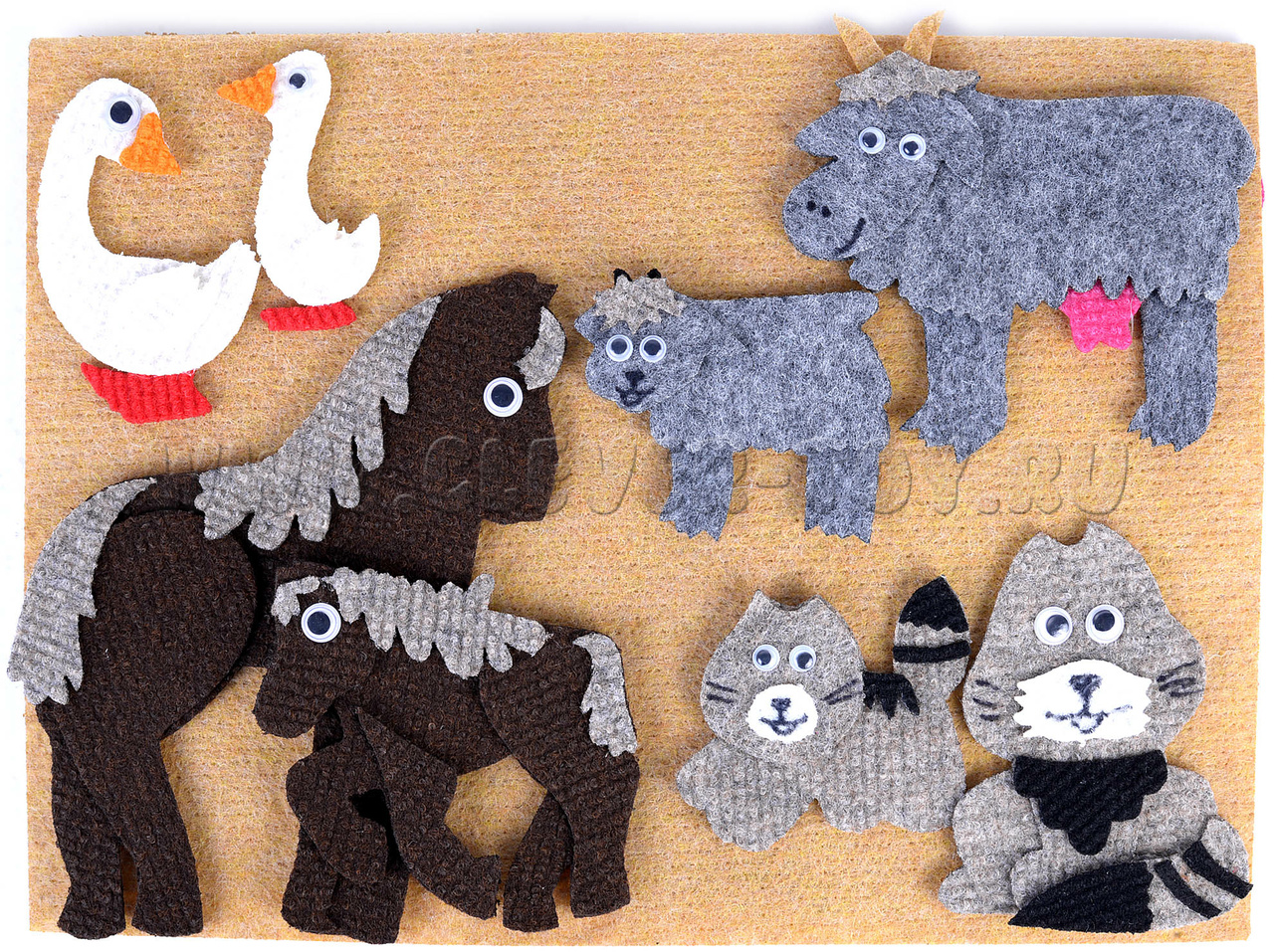 • вместе вы сможете придумать большое количество интересных историй с помощью ярких фигурок животных из ковролина,
