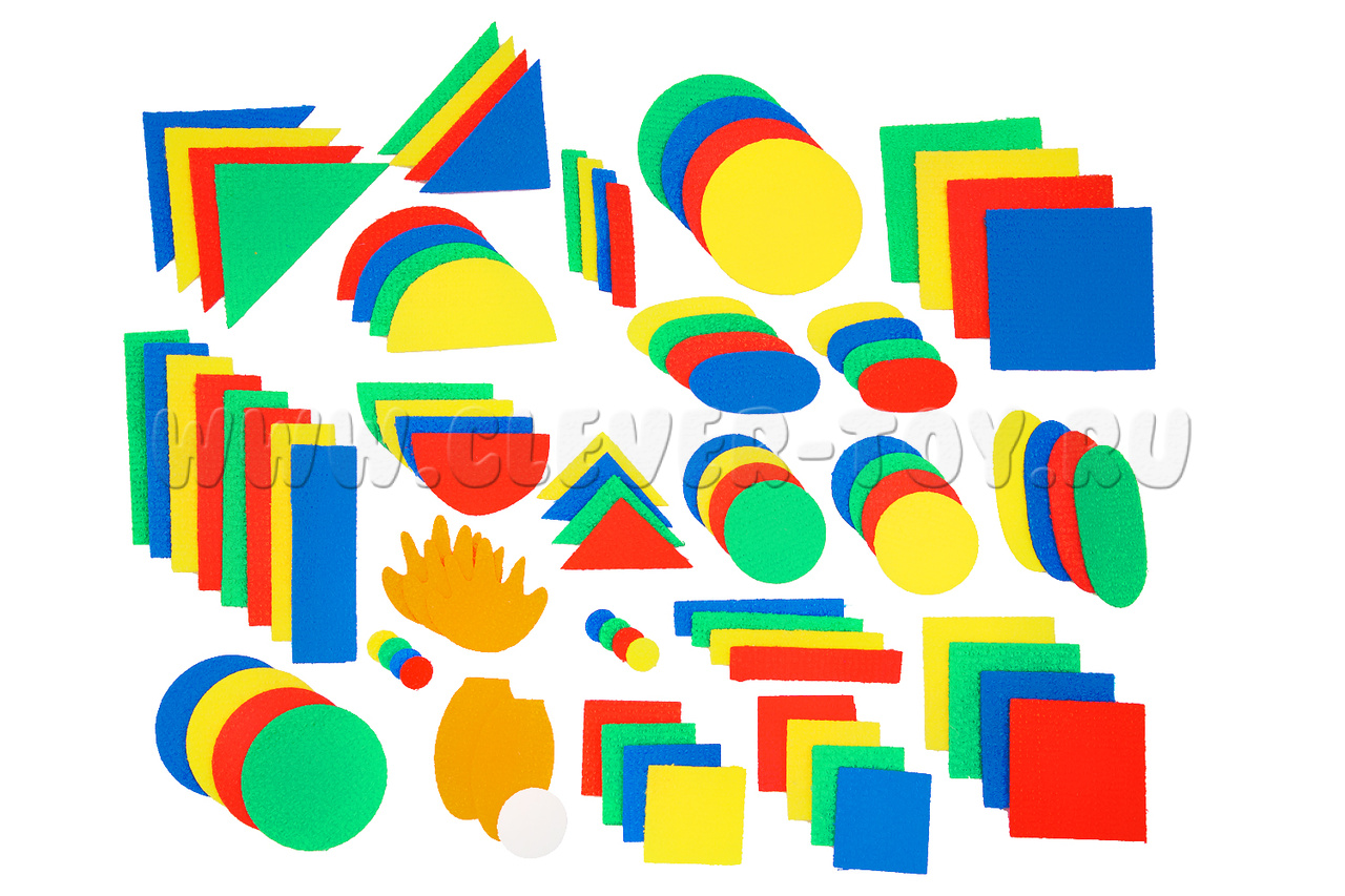 • треугольники большие, средние, маленькие 4-х цветов (синие, красные, зелёные, жёлтые) - 12 штук,