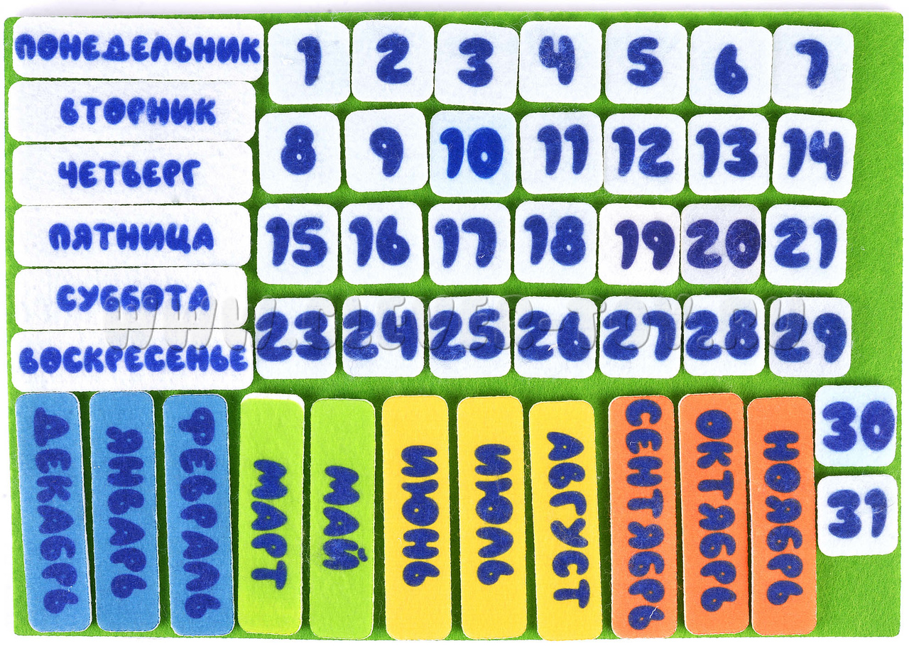 • игровые элементы: числа от 1 до 31, элементы с названиями дней недели, месяцев, времён года и т.д.