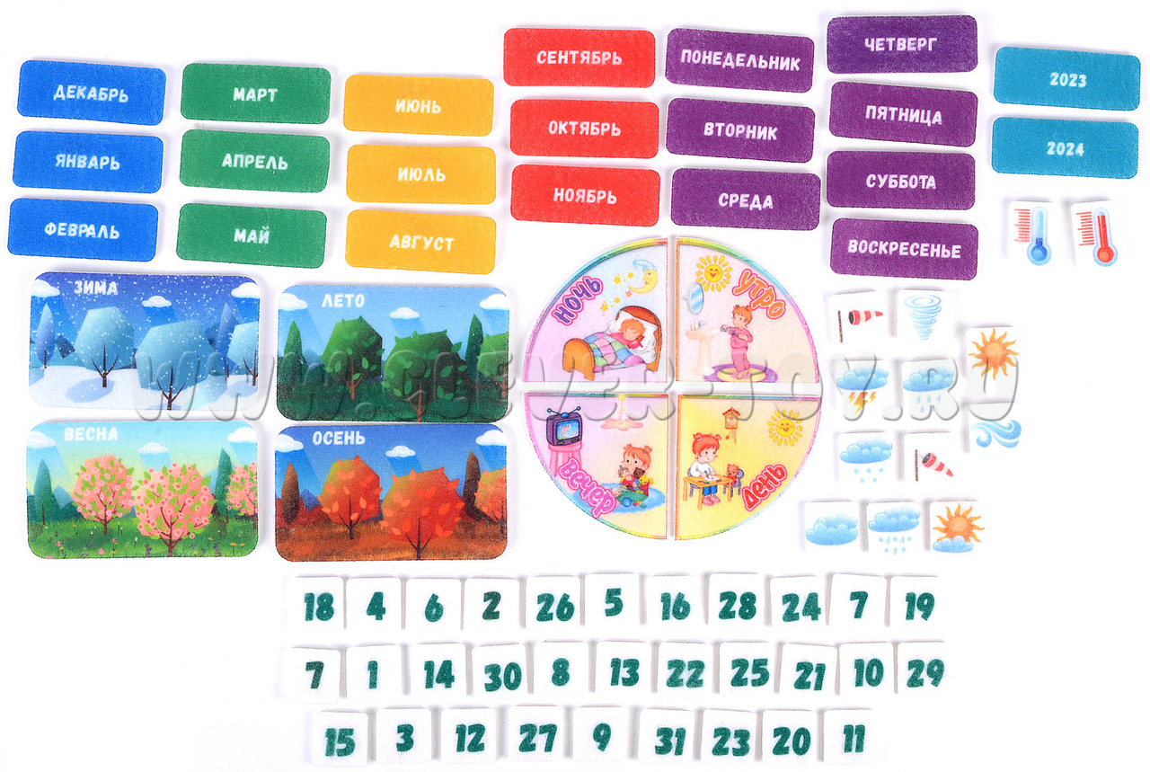 - Таблички, обозначающие времена года (4 шт.), годы (4 шт.), месяца (12 шт.), дни недели (7 шт.), числа (31 шт.), погоду (11 шт.), температуру (2 шт.), время суток (4 шт.).