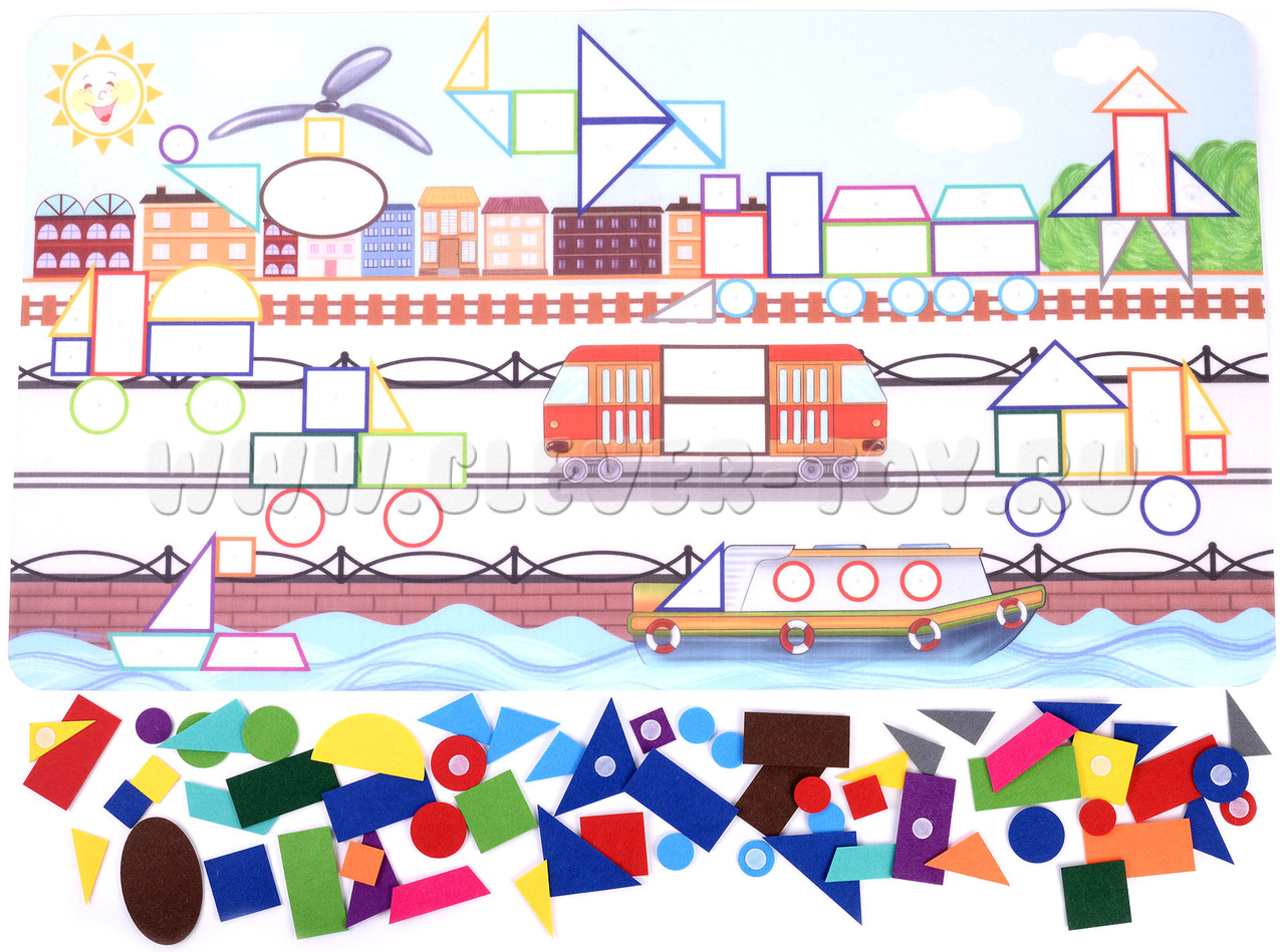 Состав набора: основа из фетра 1шт., геометрические фигуры на липучках  61 шт.