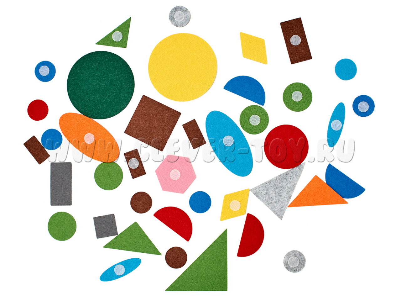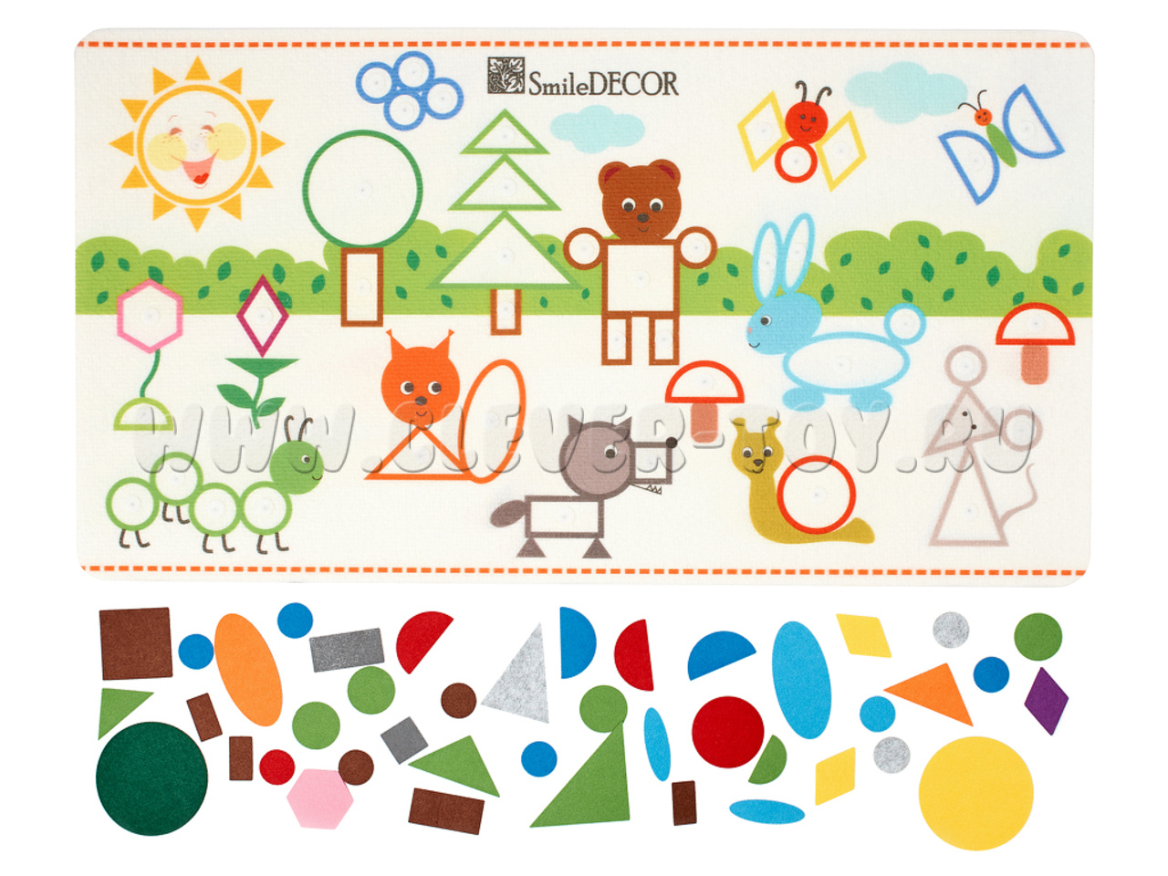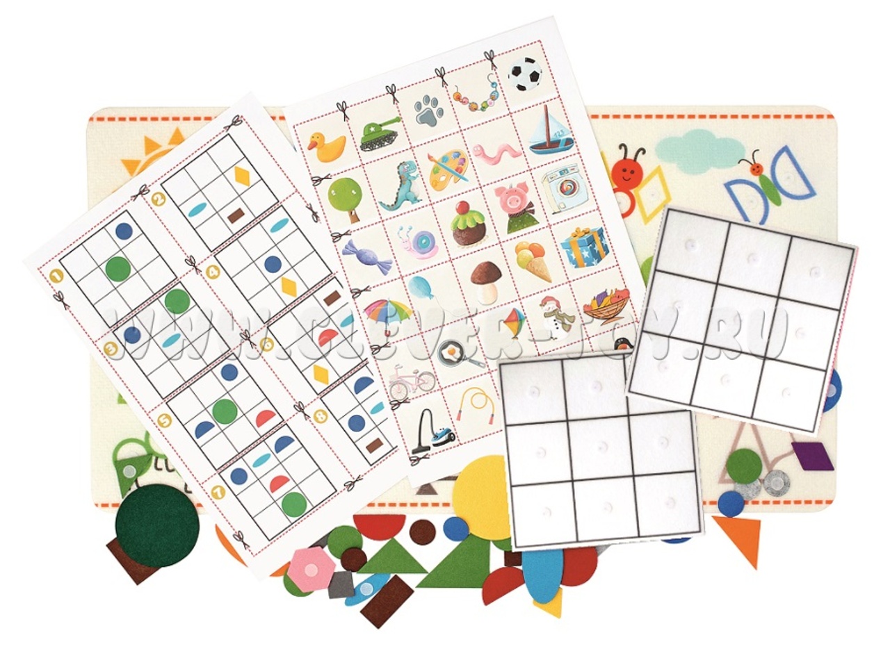 В наборе ковер из фетра (48*84 см), 42 геометрические фигуры на липучках, 2 листа карточек для вырезания, 2 планшета из 9 клеток.