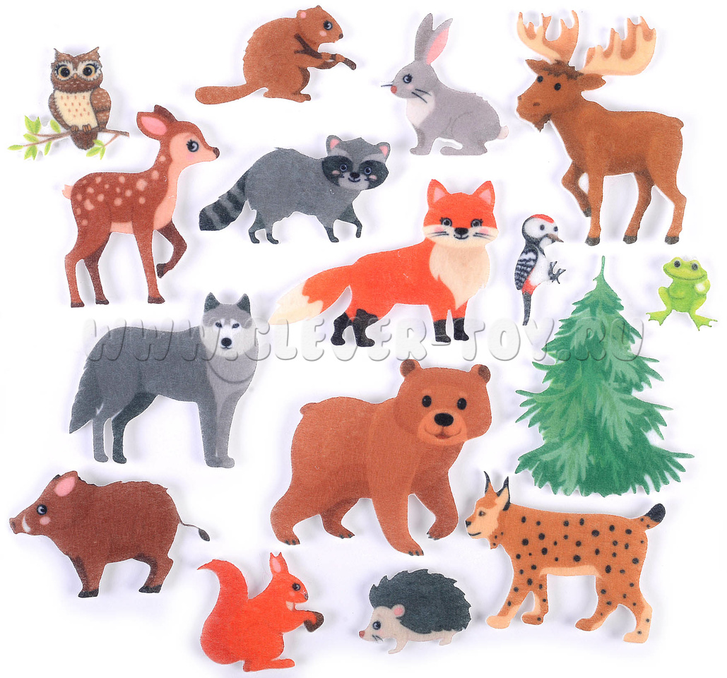 • 18 фигурок лесных животных, в том числе: мишка, белка, волк, заяц, лиса, бобёр, кабан, енот, лось и др.;