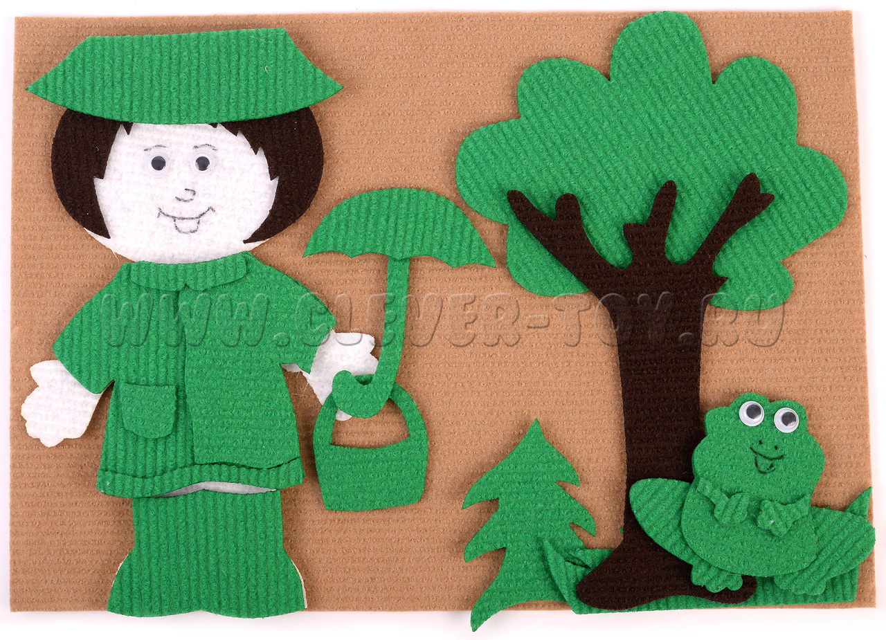 - одежда, аксессуары и атрибуты весны (зелёный): шапка, пальто, сапоги, корзинка, зонт, дерево, трава, лягушонок, цветок;