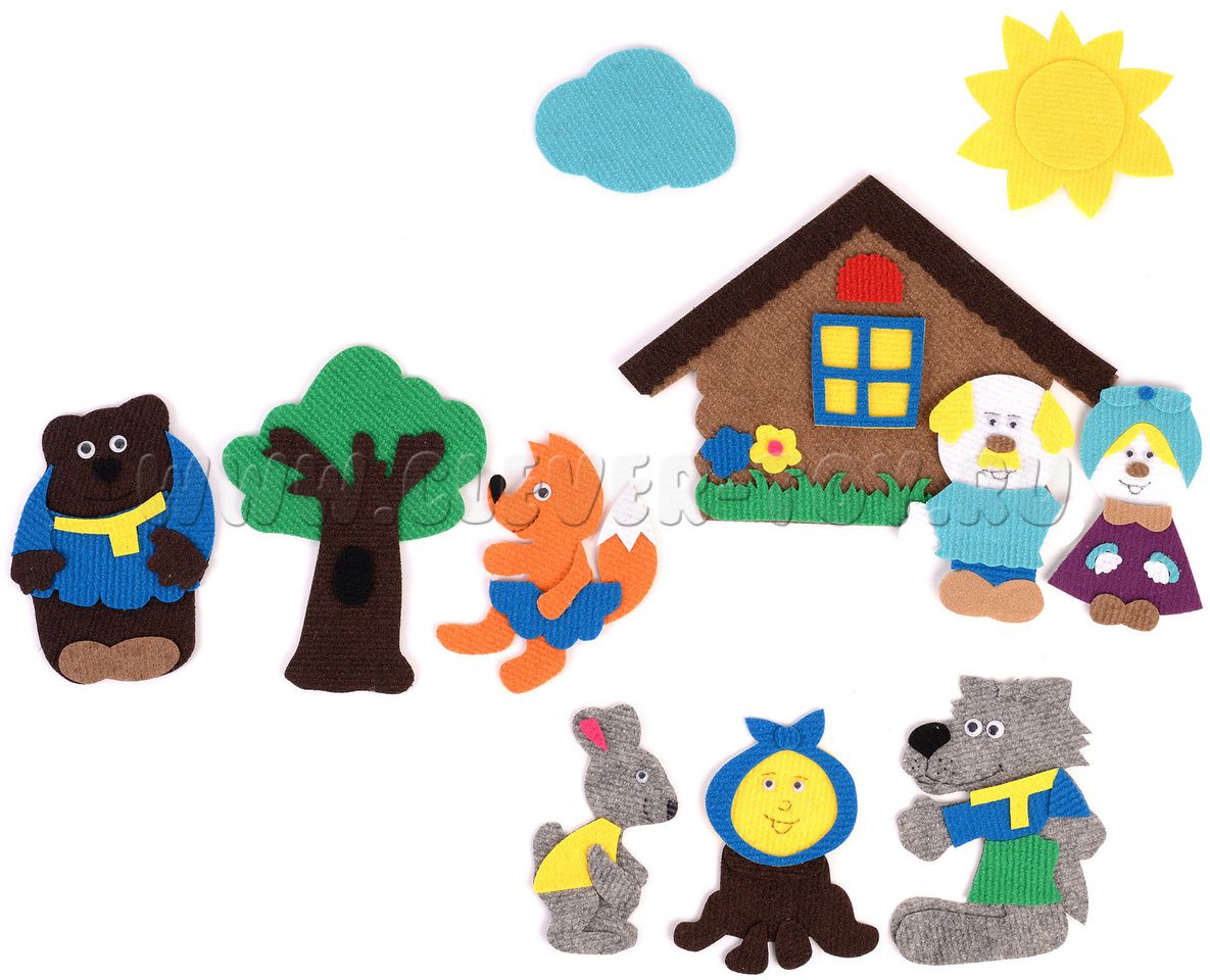 • персонажи – дед, бабка, внучка, жучка, кошка, мышка маленькая, колобок, кот, курочка Ряба, журавль, мышка-норушка, лягушка, ёжик, петушок, зайка белый, зайка серый, волк, лиса, медведь, соломенный бычок, 2 собаки, 2 охотника, матушка, медведица, медвежонок, коза, 7 козлят, 3 поросёнка;