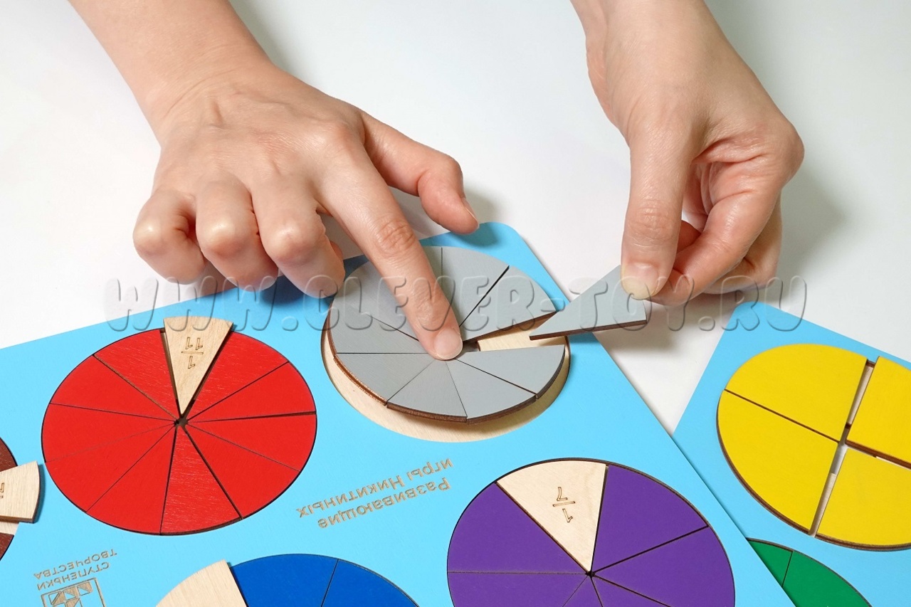 Правила игры очень простые: необходимо высыпать из кругов все части, а затем, считая и проговаривая вслух, сложить их обратно. Таким образом развиваются навыки устного счета и происходит запоминание и усвоение дробей.