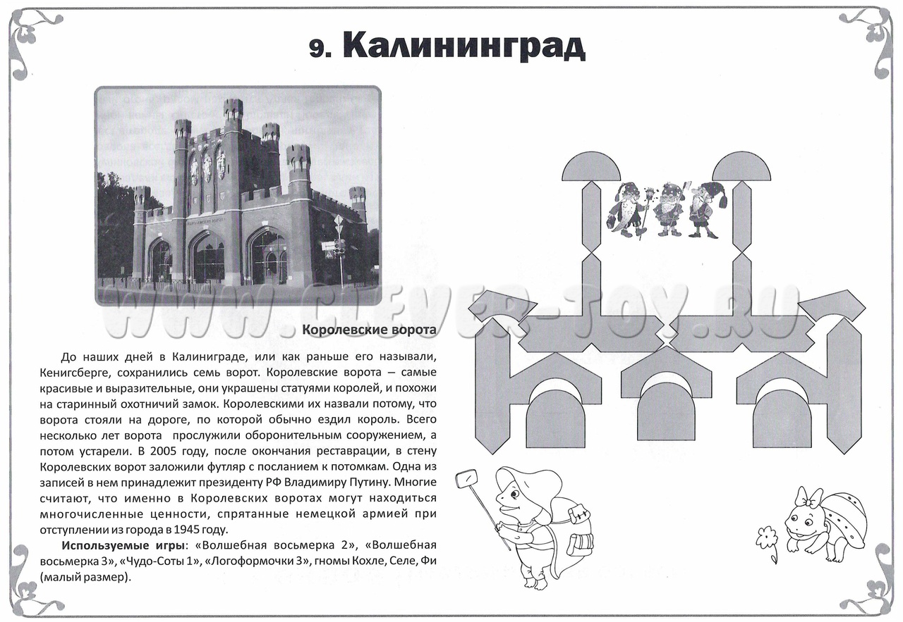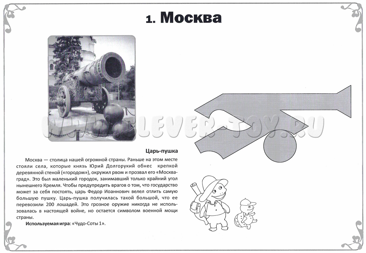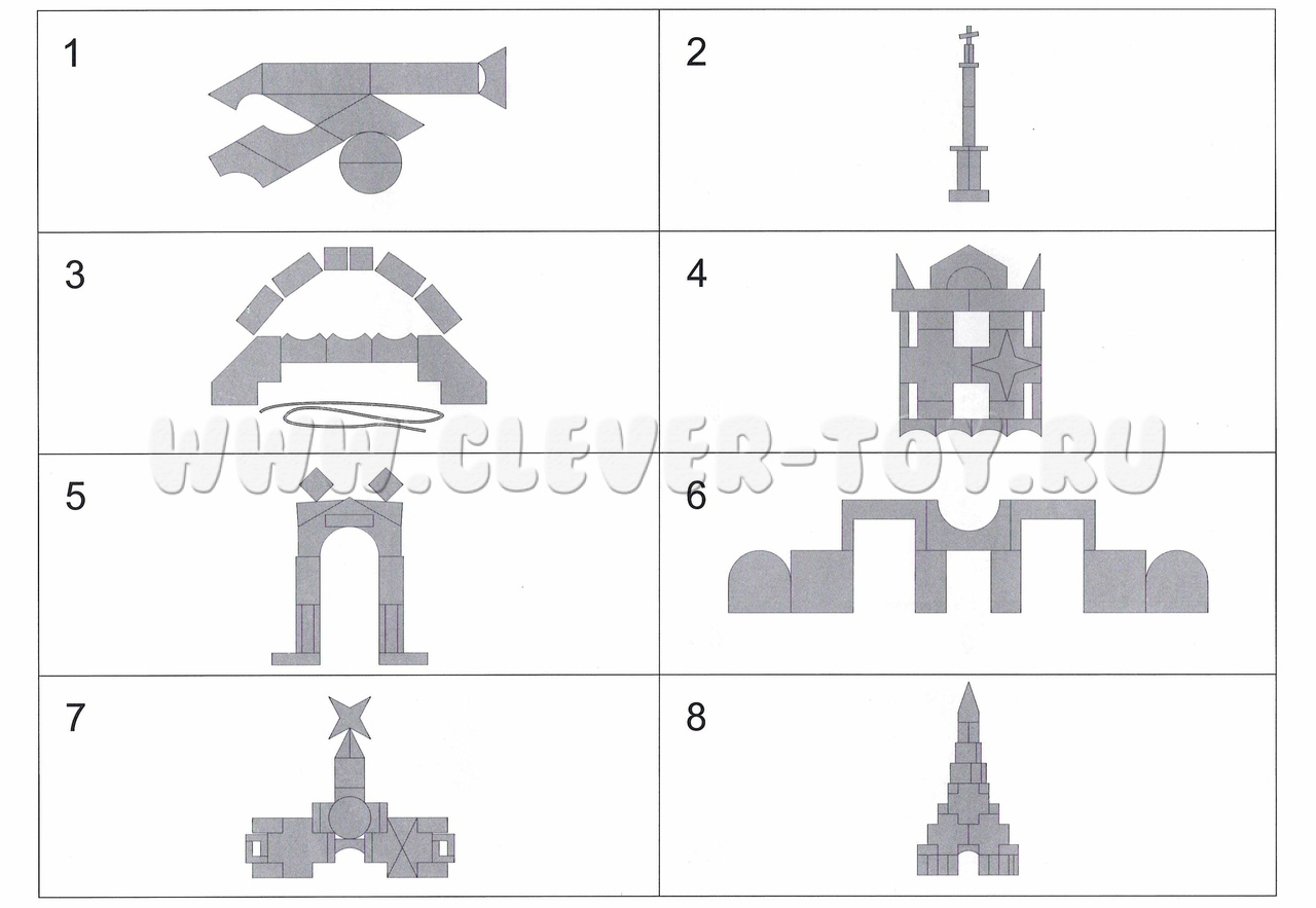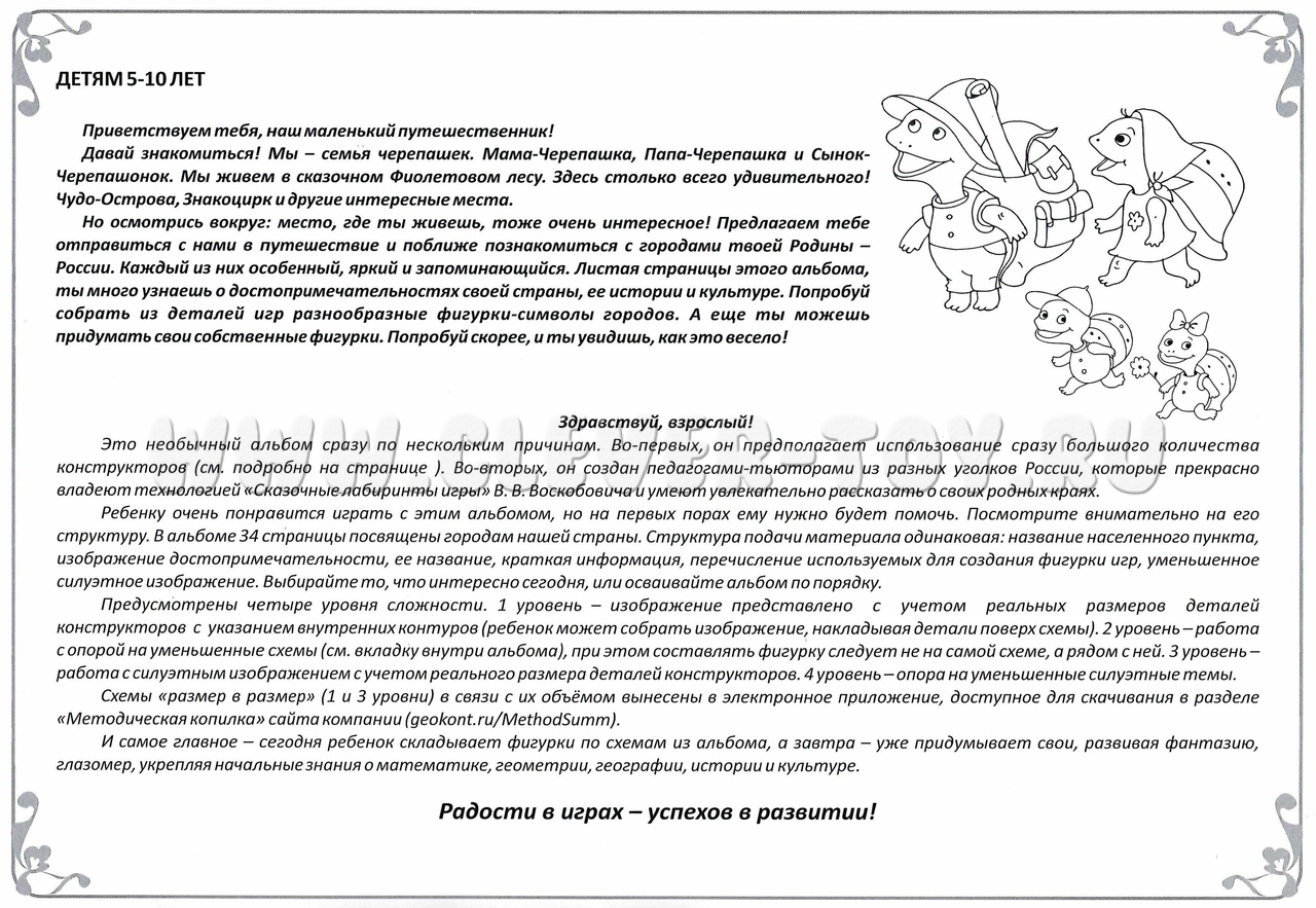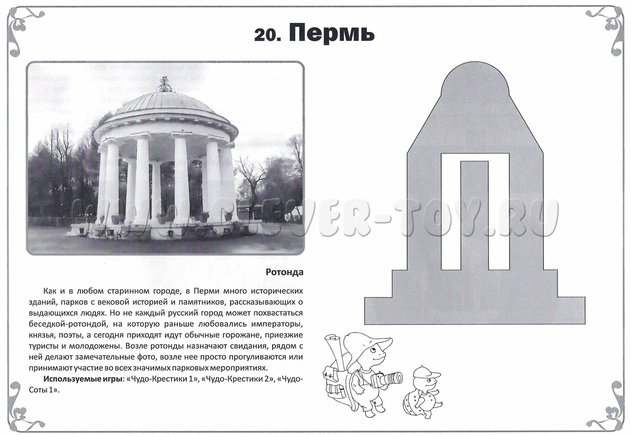 1. Альбом предлагает 34 авторские схемы для сборки фигурок – достопримечательностей и культурных символов российских городов: Москва, Санкт-Петербург, Боровичи, Вельск, Волгоград, Воронеж, Екатеринбург, Казань, Калининград, Ковров, Коломна, село Богучаны, Мирный, Мурманск, Находка, Новороссийск, Новочеркасск, Оренбург, Первоуральск, Пермь, Севастополь, Симферополь, Соликамск, Тамбов, Тольятти, Томск, Ульяновск, Хабаровск, Ханты-Мансийск, Чистополь, Чита, Энгельс, Якутск, Ярославль. Эти схемы созданы педагогами-тьюторами из разных уголков России.