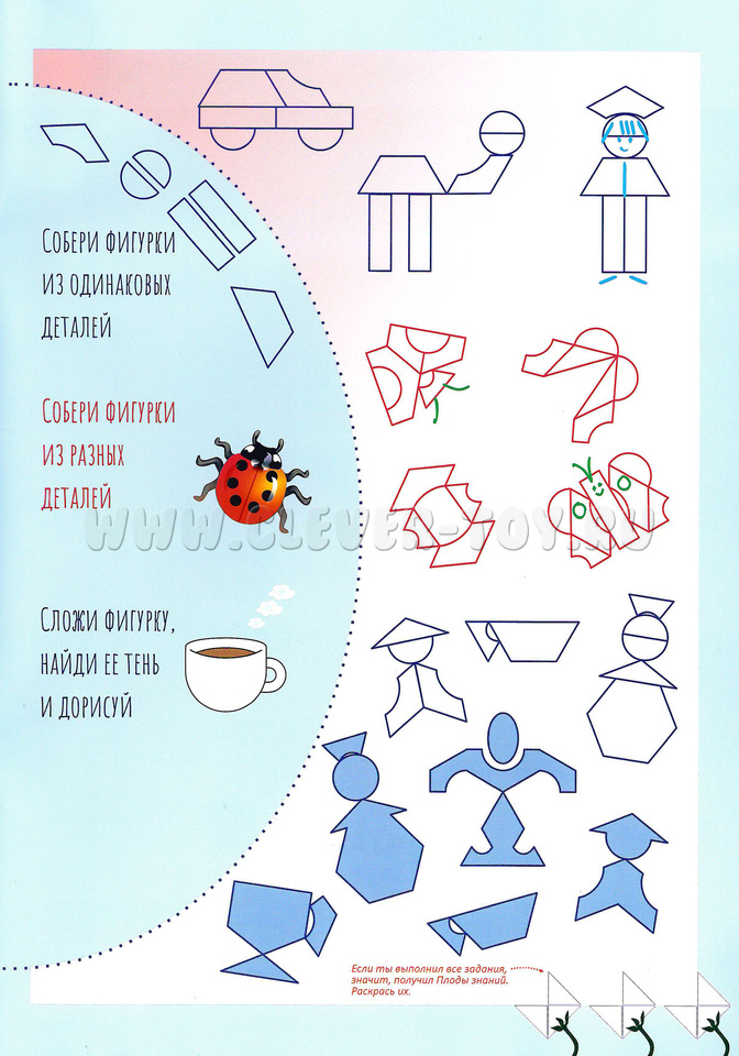 2. Изображения в альбоме отличаются по размеру и уровням сложности: на белой части листа – схематические изображения реального размера (соответствуют размерам деталей конструктора – 1 уровень сложности), сбоку расположены уменьшенные схемы, собирать по которым сложнее, и составлять фигурку можно не на самой схеме, но рядом с ней (2 уровень сложности).