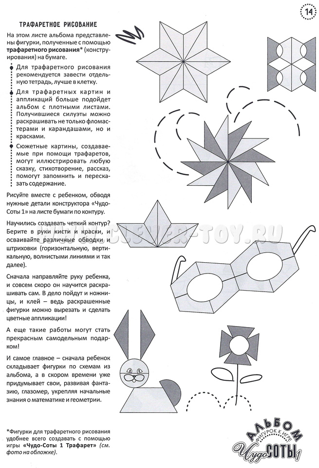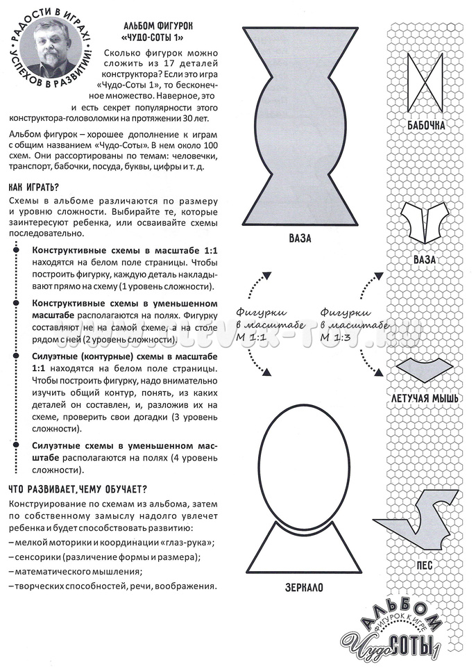 Альбом фигурок – наглядное пособие для игр с конструкторами серии «Чудо-Соты». Имеет неограниченные возможности для проявления творчества и развития ребёнка. Сегодня он складывает фигурки по схемам из альбома, а завтра – уже придумывает свои, развивая фантазию, глазомер, укрепляя начальные знания о математике и геометрии.