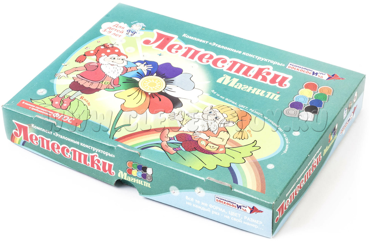 По выгодной стоимости вы получаете: 3 набора по 10 разноцветных лепестков на магнитах, радужные цвета + белый, серый и чёрный, отличающиеся по величине (большие, маленькие, средние). У каждого лепестка есть «носик», который определяет расположение детали в пространстве (повёрнута вправо, влево, вниз, вверх). Игровые элементы выполнены из картона, с обратной стороны снабжены магнитной лентой.