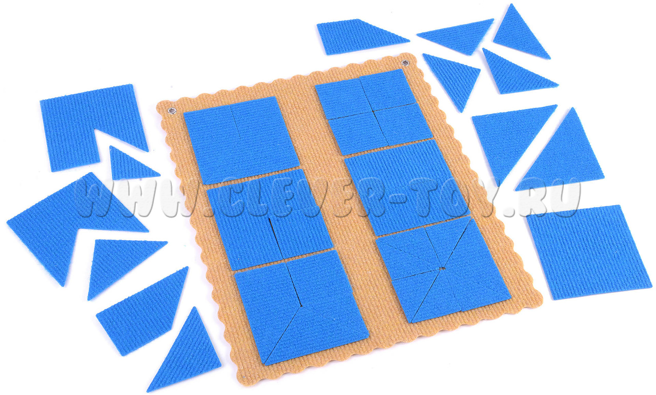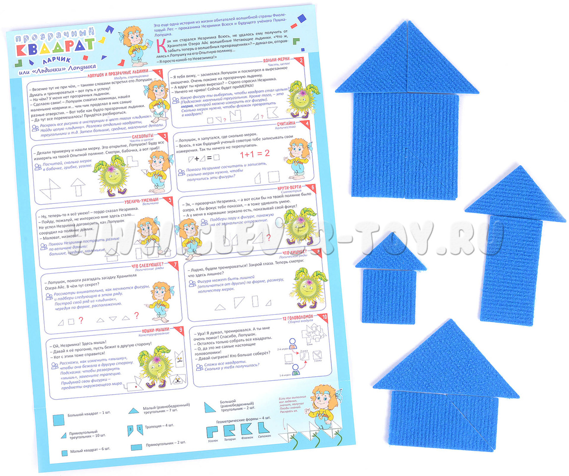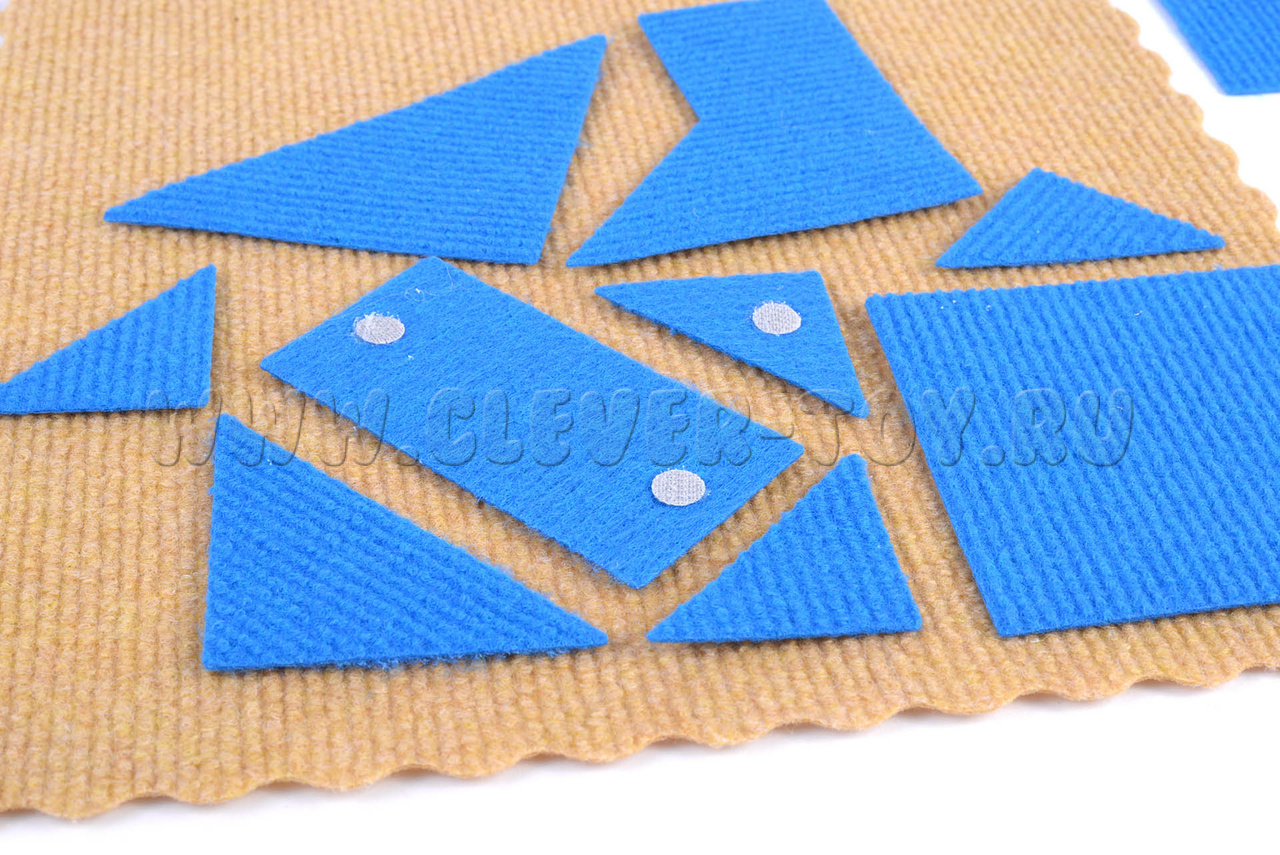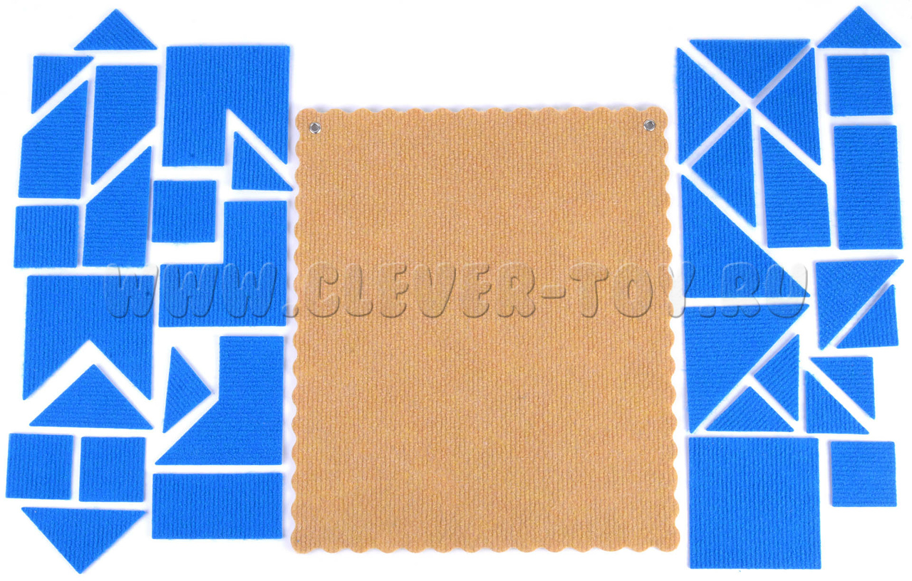 - 36 элементов из ковролина (многоугольник 1 – 1 шт., многоугольник 2 – 1 шт., многоугольник 3 – 1 шт., многоугольник 4 – 1 шт., треугольник маленький – 10 шт., треугольник средний – 7 шт., треугольник большой – 2 шт., квадрат большой – 1 шт., прямоугольник – 2 шт., трапеция 1 - 3 шт., трапеция 2 – 1 шт., квадрат маленький – 6 шт.;