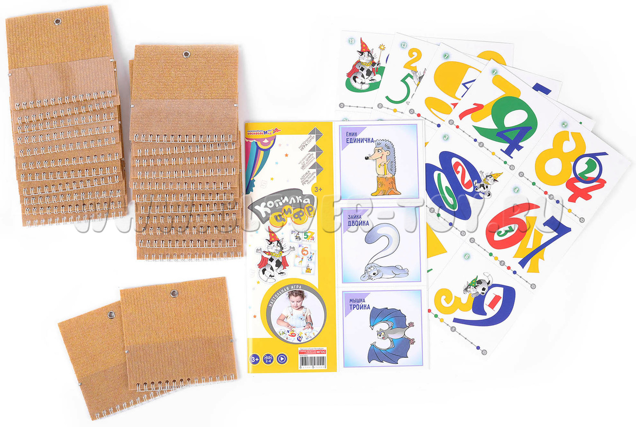 - 48 картонных карточек (105х100 мм): 24 игровых с цифрами (от 1 до 9), 24 призовых, обозначающих цвет, размер, положение (предлог),