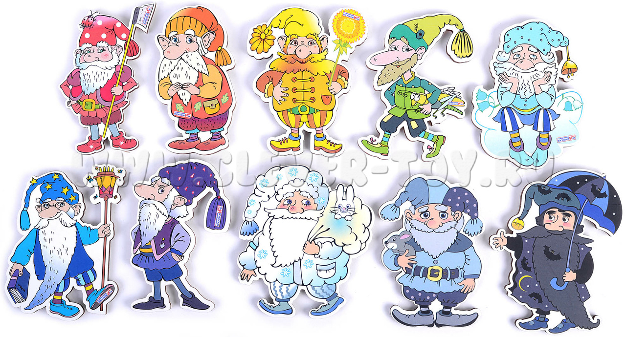 1. Гномы (10 шт), контурные фигуры (фанера, цв. плёнка); Крепление: липучка (контактная лета), магнит;