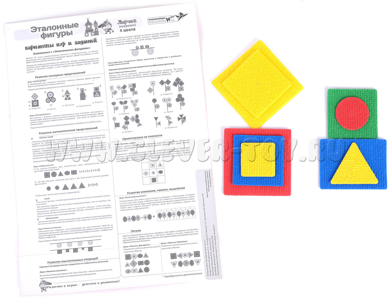 Разноцветные геометрические фигуры выполнены из безопасного современного материала – ковролина, аккуратно вырезаны на специальном станке, легко крепятся на ковролиную игровую основу с помощью многоразовых липучек.