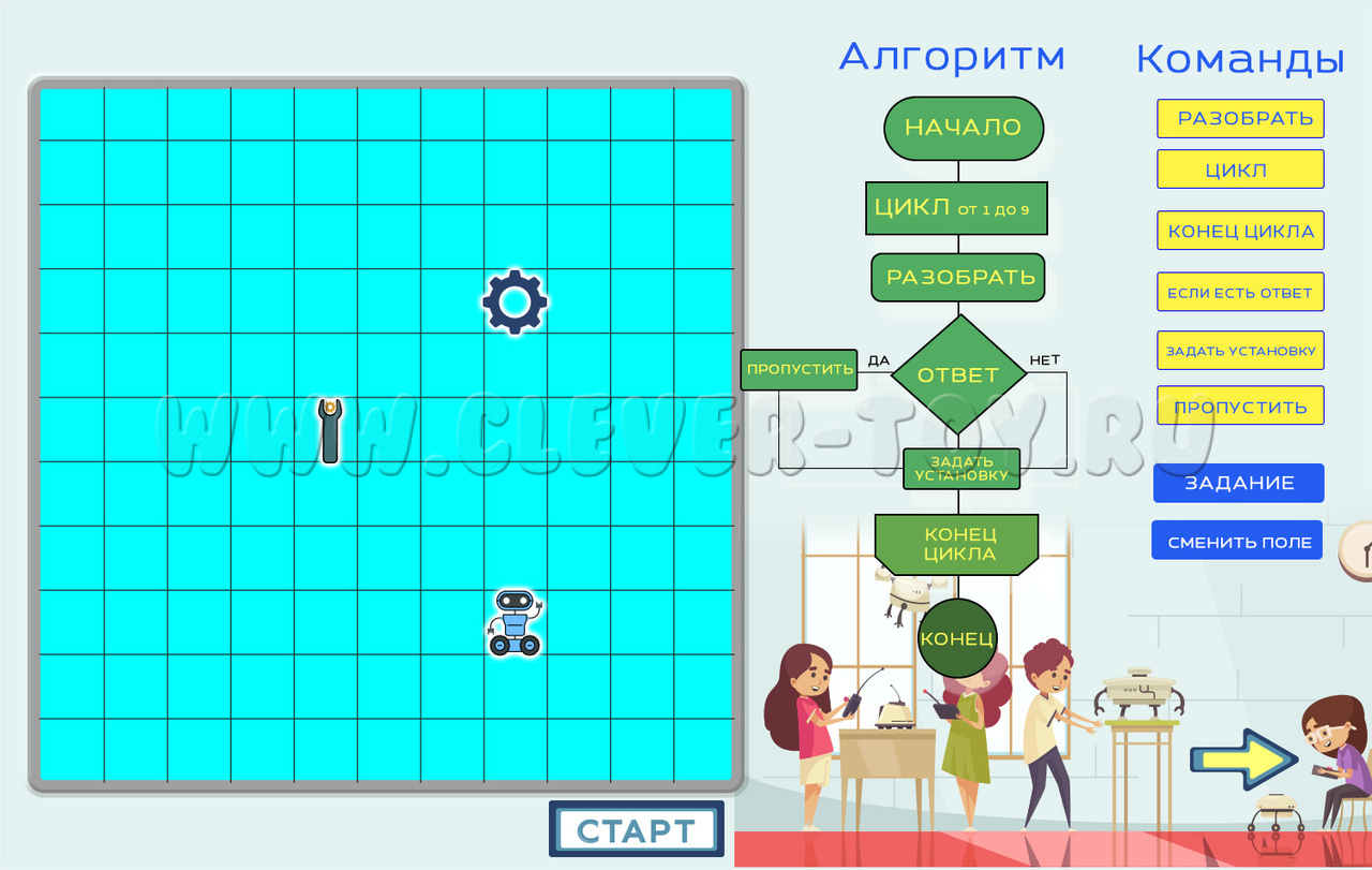 Типы заданий - викторины, алгоритмы, создание флеш- анимации, тесты, пазлы, уроки, иллюстрации, шахматы и шашки.