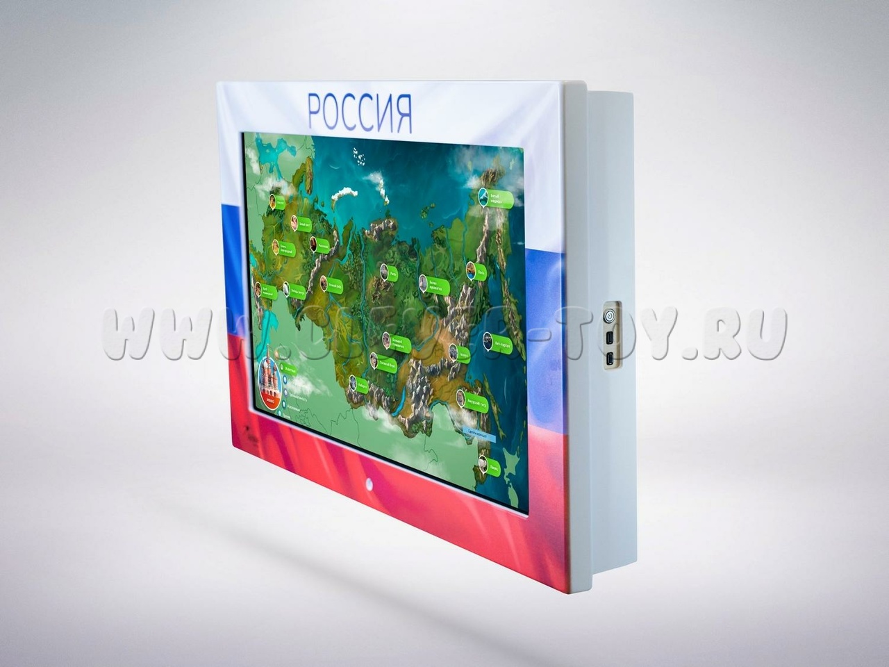 • Интерактивная настенная панель, оформленная в стилистике российского триколора. (43 дюйма, Full HD, мультитач 10 касаний, характеристики встроенного компьютера уточняйте у менеджера)