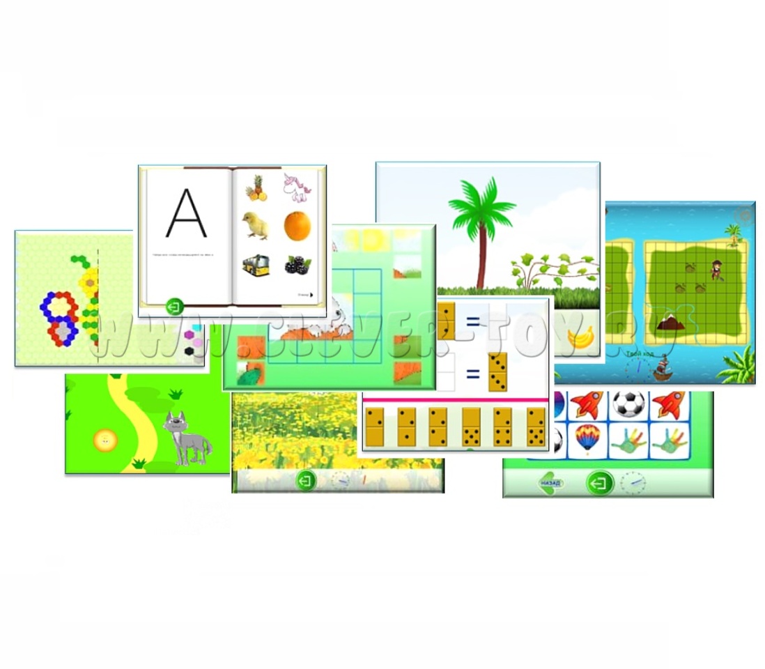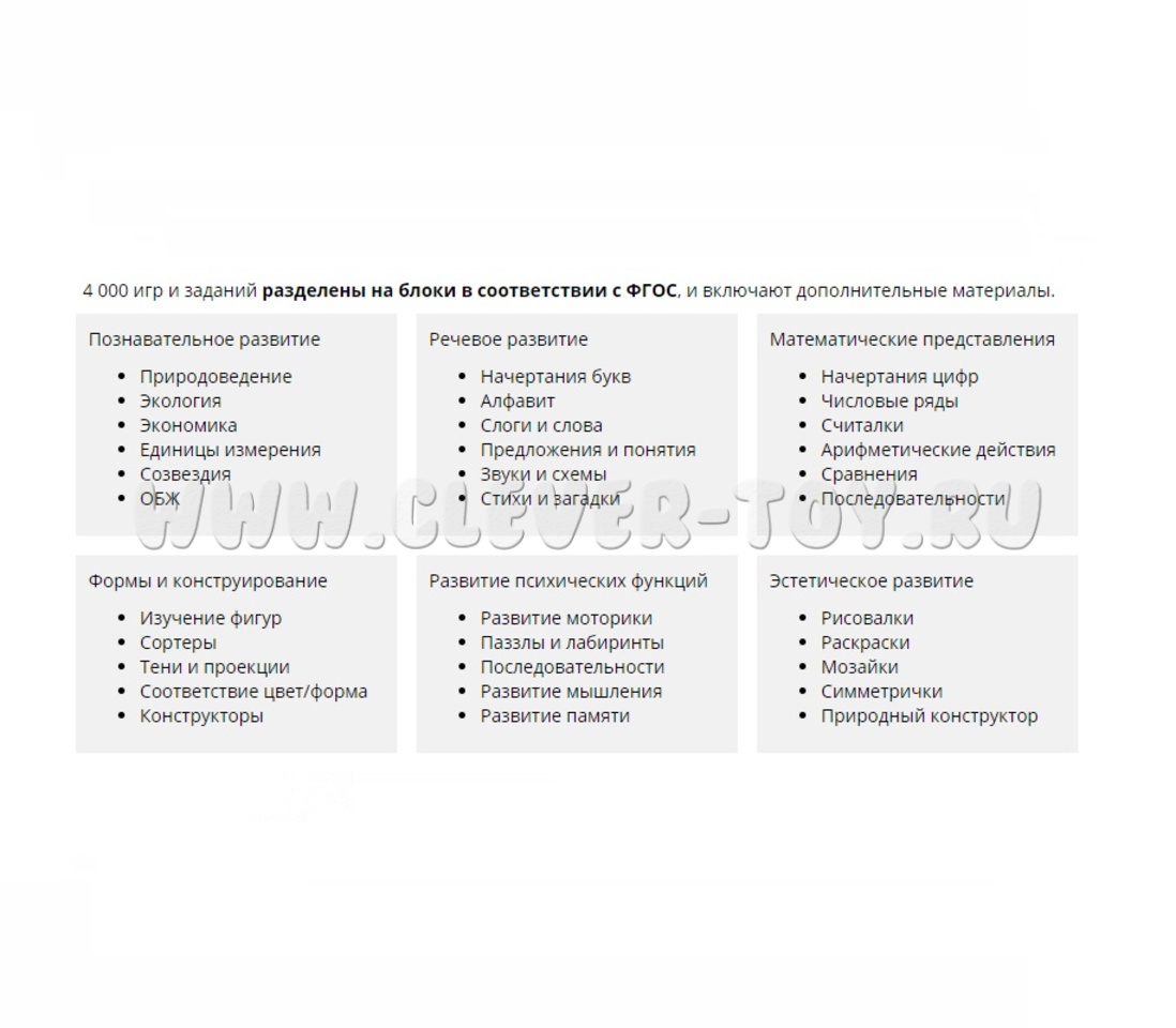 А еще - множество игр и заданий, направленных на всестороннее развитие ребенка. В комплекте вы найдете следующие обучающие разделы: