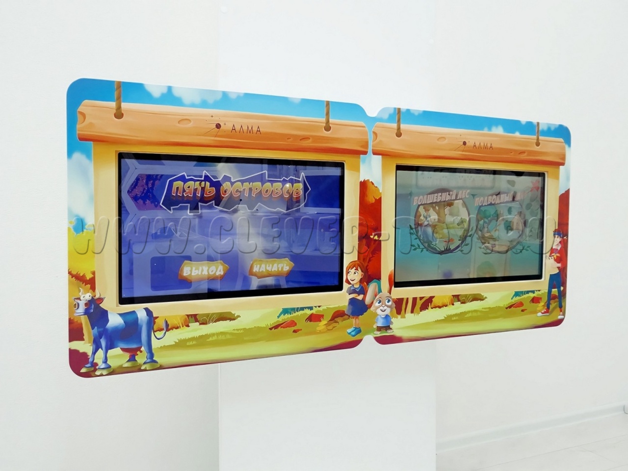 - ДВЕ интерактивных настенных панели по 25 дюймов в одном корпусе, украшенным детскими картинками и персонажами из программного обеспечения (Full HD, мультитач 10 касаний, intel, 4 гб RAM, SSD 120 гб, win 10);