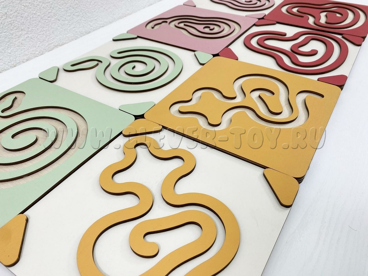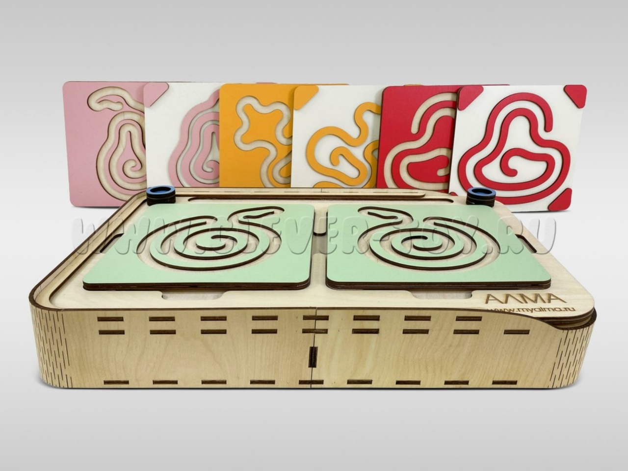 Два лабиринта с изображениями, расположенными симметрично, вставляются в пазы, и ребёнок проходит их с помощью специальных пальчиковых фишек.