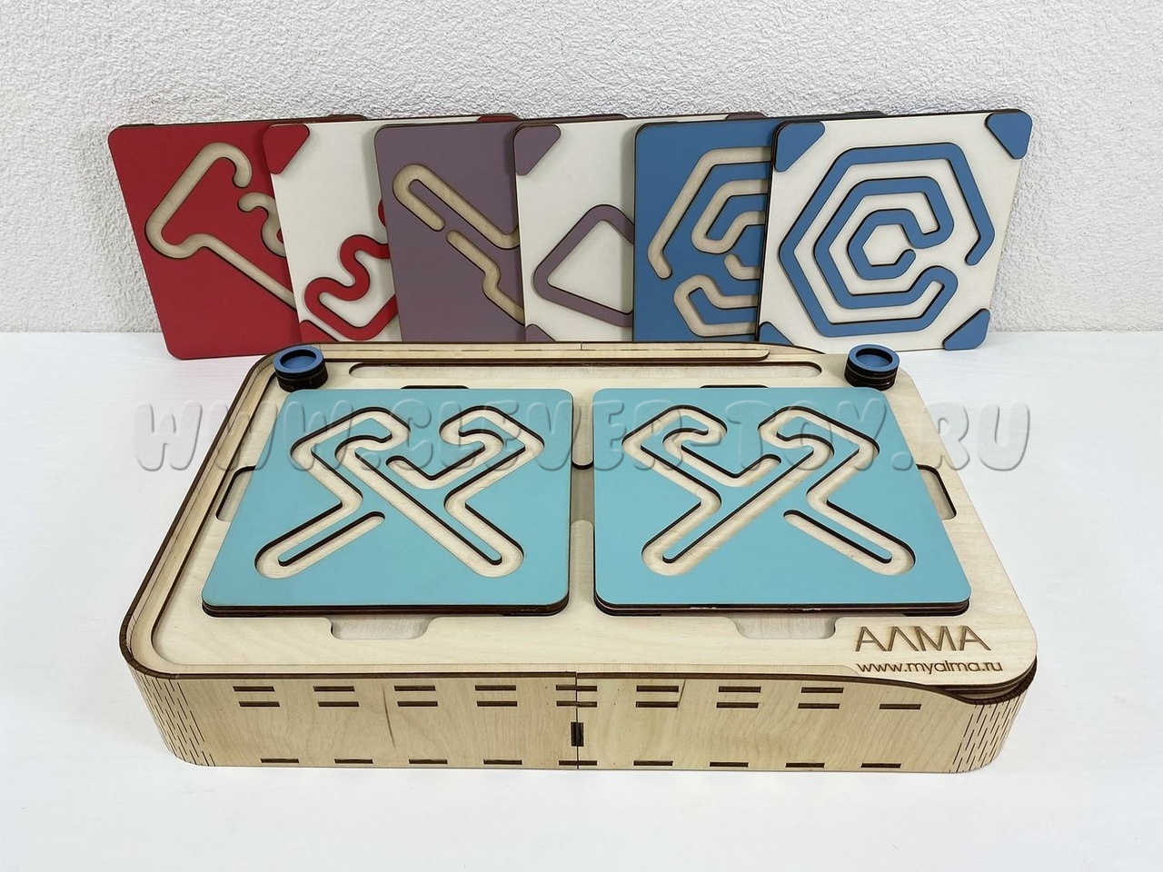 Два лабиринта с изображениями, расположенными симметрично, вставляются в пазы, и ребёнок проходит их с помощью специальных пальчиковых фишек.