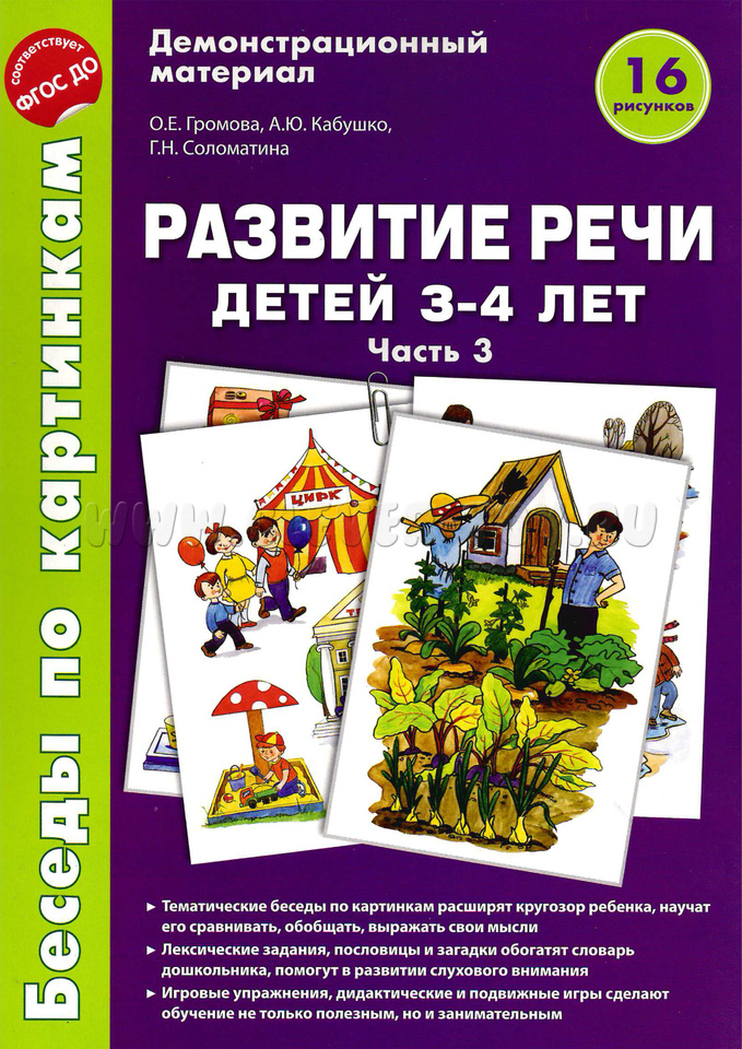 Методическое пособие "Занятия по развитию речи детей 3-4 лет" соответствует содержанию наглядного пособия, дополняет и расширяет его (пособие приобретается отдельно).