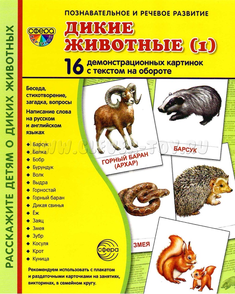 Состав комплекта (16 карточек): Барсук, Белка, Бобр, Бурундук, Волк, Выдра, Горностай, Горный баран, Дикая свинья, Ёж, Заяц, Змея, Зубр, Косуля, Крот, Куница