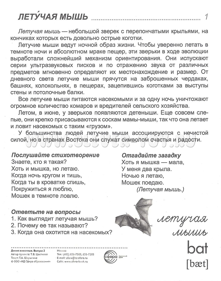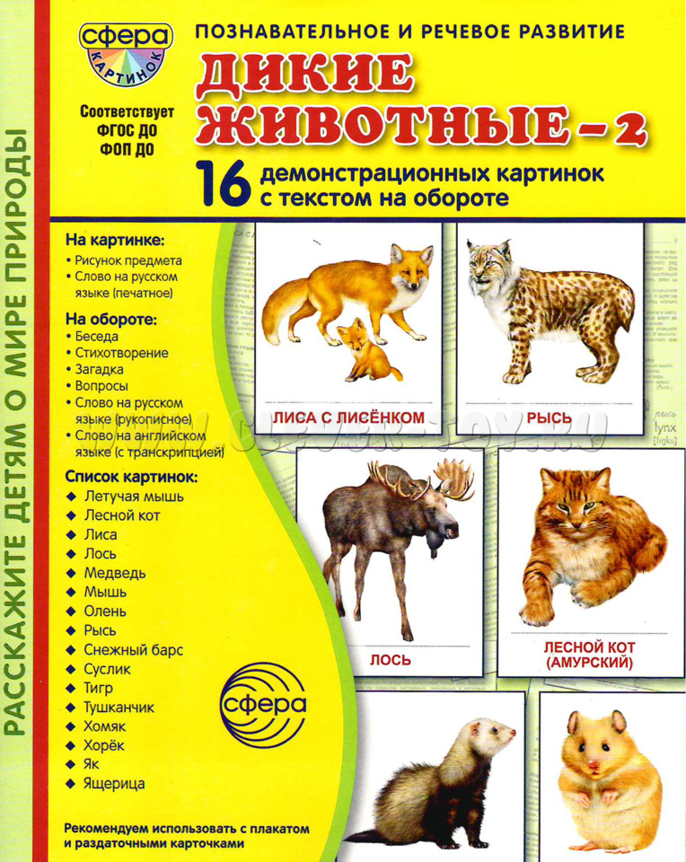 На обороте каждой предметной картинки - описание животного, стихотворение, загадка, вопросы для ребёнка, название животного на русском и английском языках. Комплект подходит для индивидуальной и групповой работы, с детьми 3-7 лет.