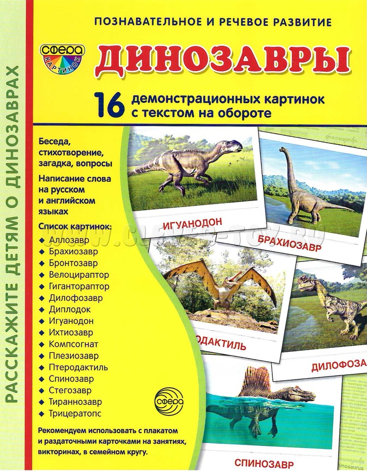 Комплект "Динозавры" состоит из 16 цветных демонстрационных карточек (картинок) и адресован детям и их родителям, желающим познакомиться с удивительным миром хищных и травоядных животных, живших много миллионов лет назад.