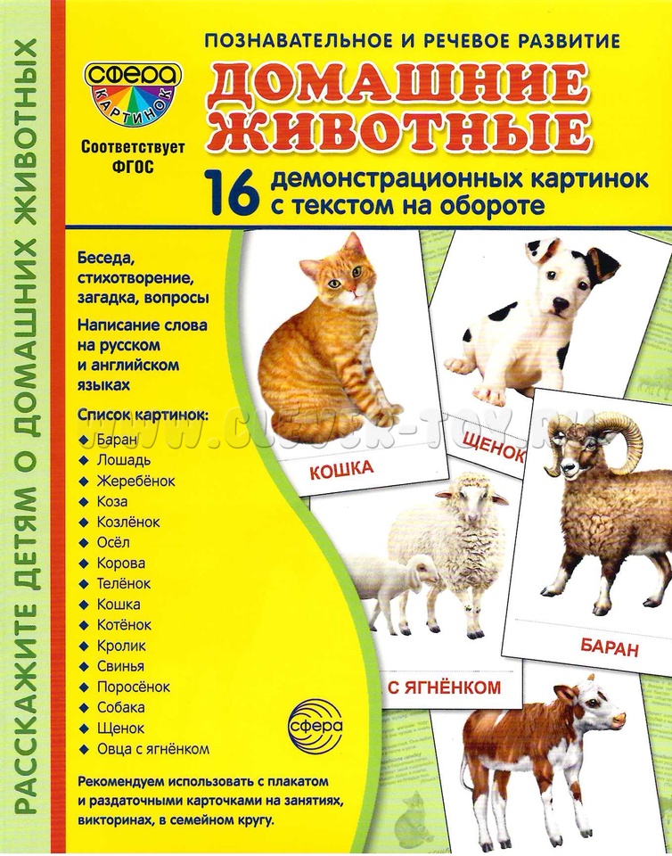 Состав комплекта (16 карточек): Баран, лошадь, жеребёнок, коза, козлёнок, осёл, корова, телёнок, кошка, котёнок, кролик, свинья, поросёнок, собака, щенок, овца с ягненком.