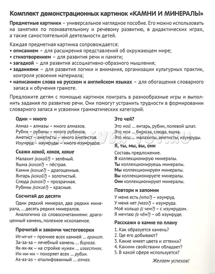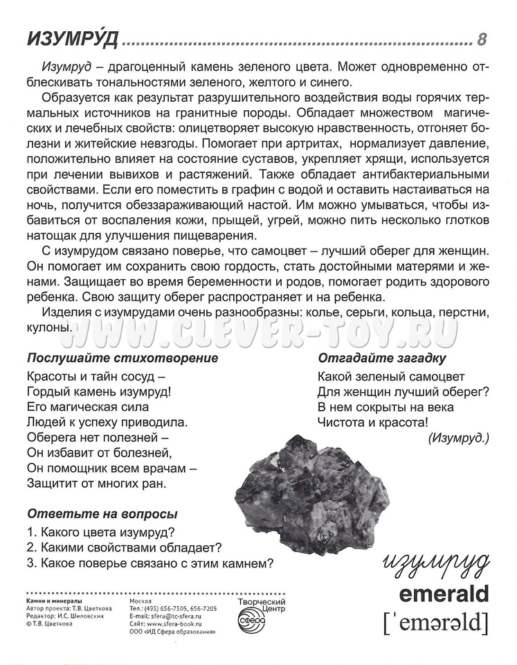 На лицевой стороне каждой карточки дается цветное изображение камня в необработанном и обработанном видах, на обратной - подробное описание, из которого дети узнают много интересного и даже поучительного!