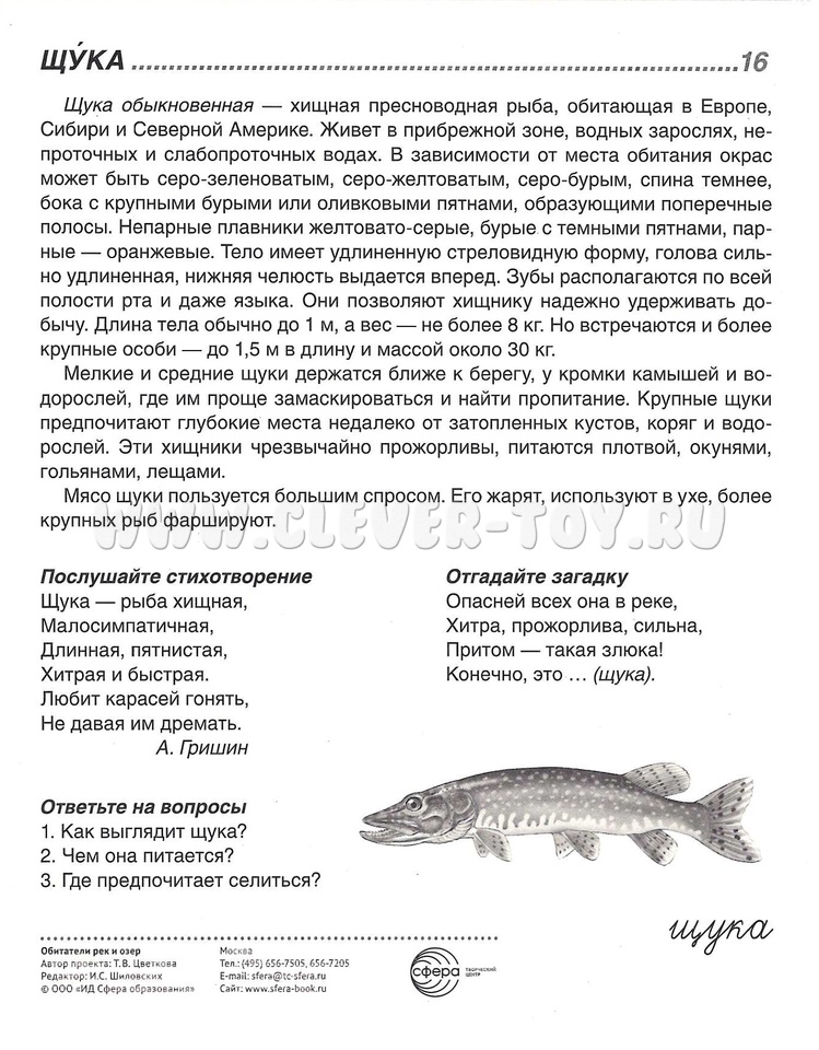 Комплект "Обитатели рек и озер" познакомит детей с удивительным миром пресноводных рыб, моллюсков и даже рептилий. Многие из них уже известны, а о некоторых дети узнают впервые. Издание состоит из 16 цветных картинок с текстом на обороте. Дети не только получат ценную информацию, но и ответят на вопросы, отгадают загадки и прочитают стихотворения.