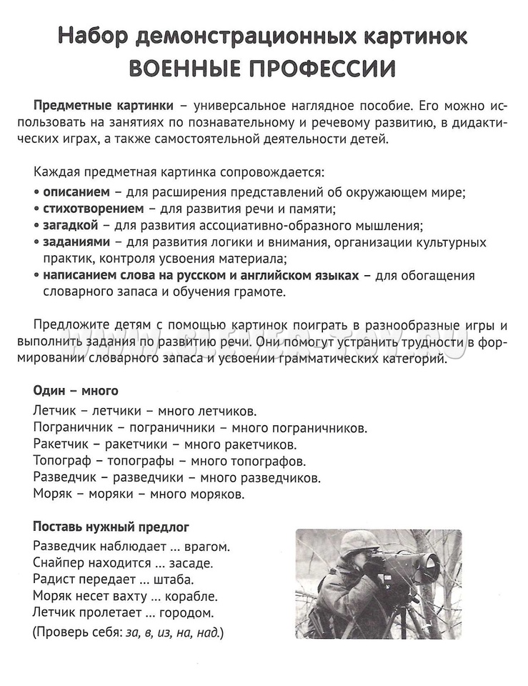 На лицевой стороне каждой карточки дается цветное изображение военнослужащего определенной военной специальности, на обратной - подробное описание, из которого дети узнают немало важных фактов о военной службе и образцах вооружения. Для лучшего закрепления материала представлены оригинальные стихотворения и рифмованные загадки по теме, а также вопросы, на которые ребенок ответит после изучения материала или беседы со взрослым.