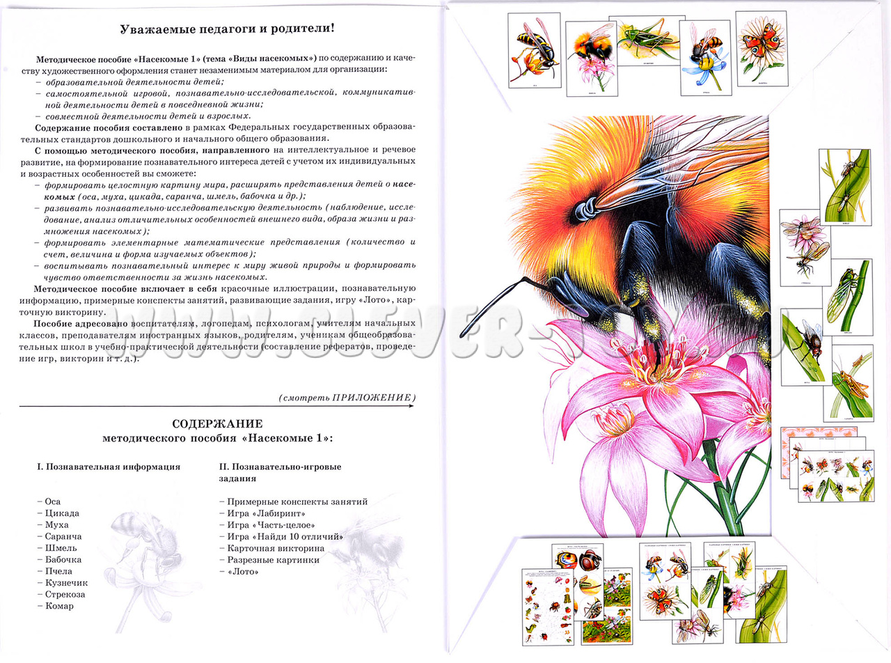 Учебно методическое пособие "Насекомые 1" данное пособие предназначенное для групповых и индивидуальных занятий с детьми 3–5 лет в детском саду и дома, познакомит детей с разными видами насекомых таких как оса, шмель, кузнечик, пчела, бабочка, комар, стрекоза, цикада, муха, саранча.
