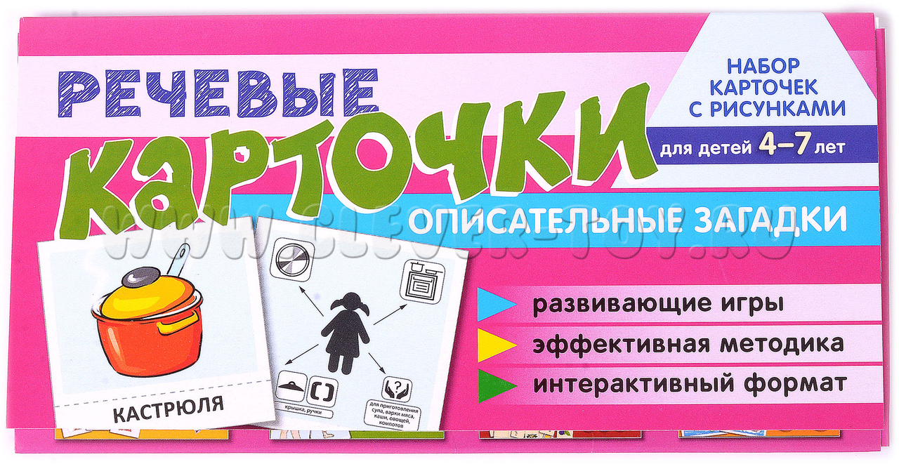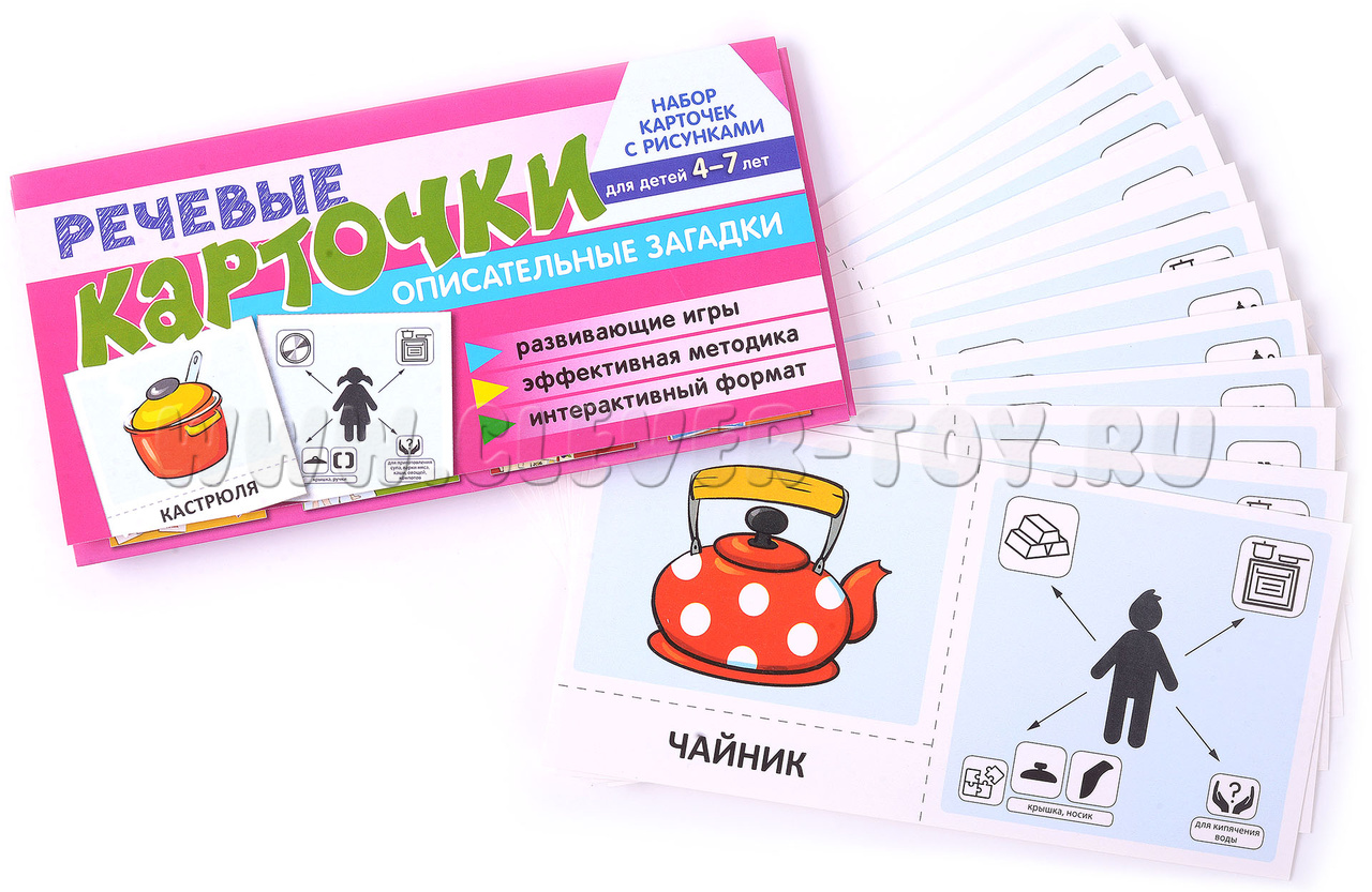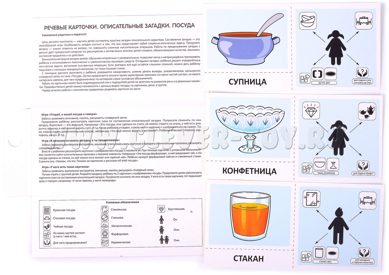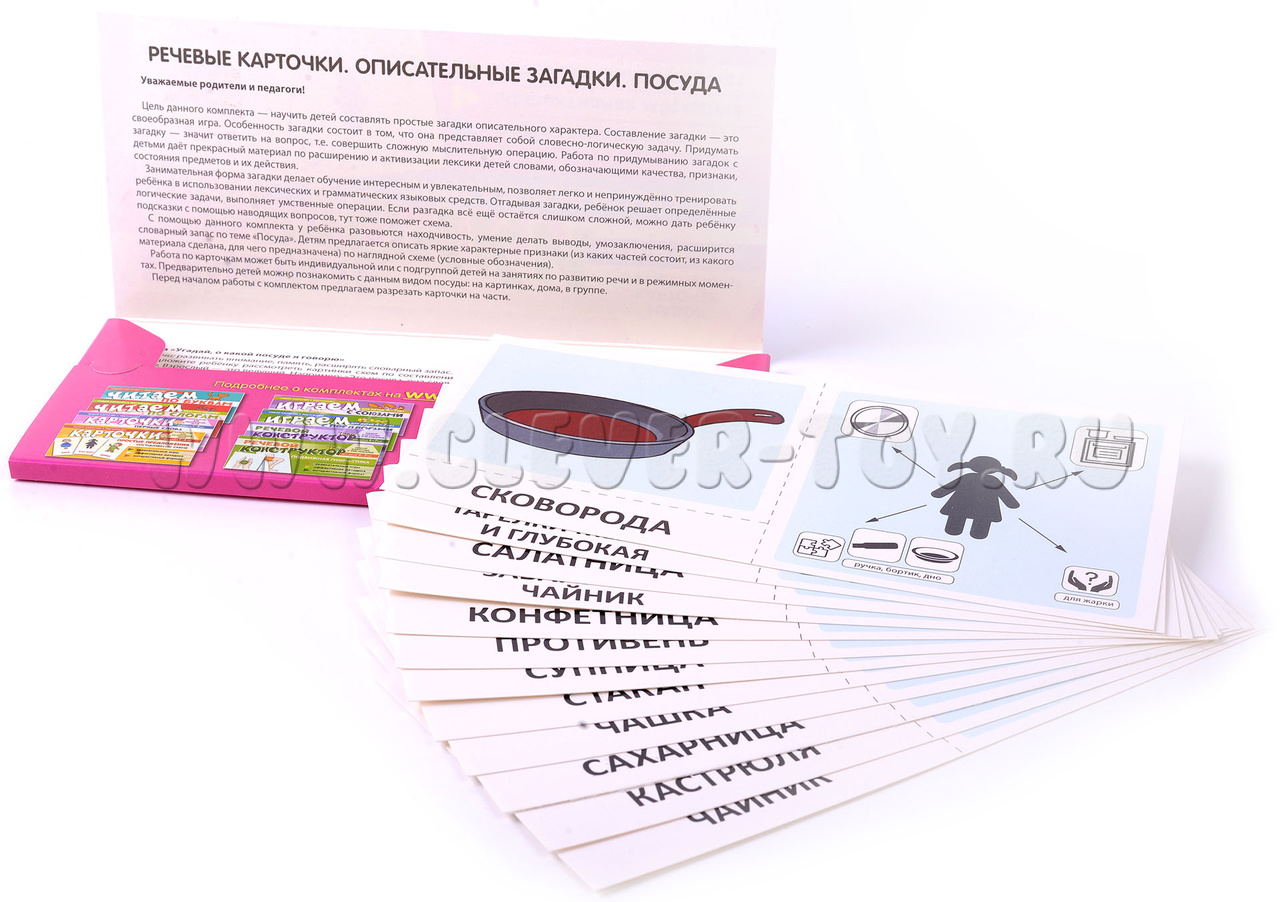 Набор "Речевые карточки. Описательные загадки. "Посуда" состоит из 12 листов, на которых размещены 36 карточек и 3 игры.