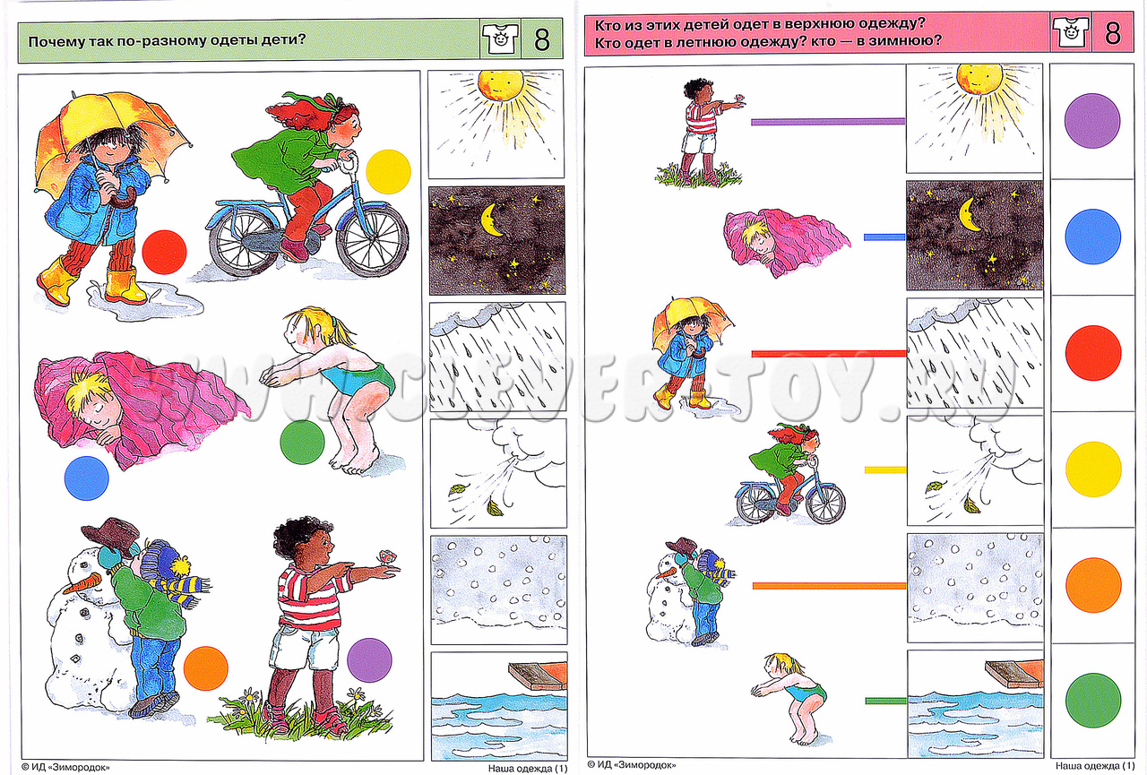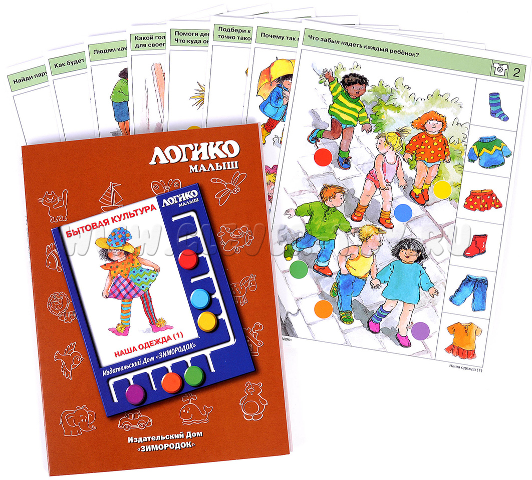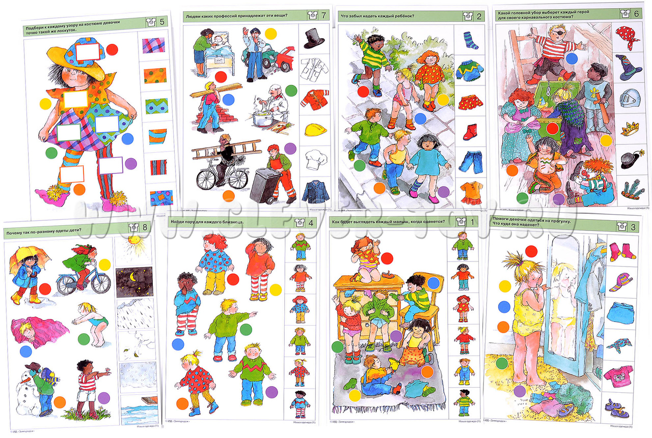 Ежедневно ребёнок учится правильно пользоваться одеждой, узнает её назначение для различных видов деятельности людей и своих бытовых нужд, осуществляет выбор тех или иных вещей в зависимости от погодных условий, осваивает разумный порядок надевания и хранения разнообразных предметов собственного гардероба. Настоящий комплект активизирует весь повседневный практический опыт ребёнка, систематизирует, расширяет и углубляет приобретённые им знания, позволяет устанавливать причинно-следственные связи между различными видами одежды и различными погодными явлениями, сезонными изменениями в природе. Задания по теме равномерно распределены на два комплекта карточек Одежда (1) и Одежда (2) и не повторяются. Примеры заданий в карточках: 1а. Как будет выглядеть каждый малыш, когда оденется? 2а. Что забыл надеть каждый ребёнок? 3а. Помоги девочке одеться на прогулку. Что куда она наденет? 6а. Какой головной убор выберет каждый герой для своего карнавального костюма? 7а. Людям каких профессий принадлежат эти вещи?