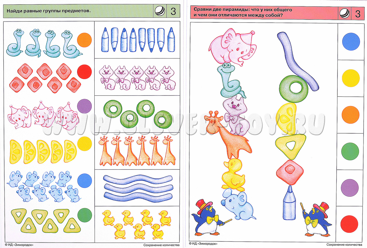 Задания настоящего комплекта предполагают последовательное знакомство ребёнка с принципом сохранения количества, который определяет независимость количества (числа) предметов от их расположения в пространстве, наличия либо отсутствия у них общих признаков (формы, величины, цвета, веса и т.д.). Ребёнок освоит приёмы оптимизации счёта: визуальный охват некоторого количества предметов; присчитывание к визуально узнаваемому количеству остальных предметов по единицам, двойкам, тройкам. Также уделяется внимание обучению вести прямой и обратный счёт, ориентироваться в отрезках натурального ряда чисел, узнавать и называть цифры. Примеры заданий в карточках: 2а. Найди одинаковые по количеству группы танцоров. 4б. Сравни две пирамиды мышат: что у них общего и чем они отличаются между собой? 5а. Клоун растерял вещи. Сколько каких? 7б. Назови числа на ступеньках лесенки и дорожке в прямом и обратном порядке. 8а. Сколько предметов появилось из шляпы в каждом облачке?