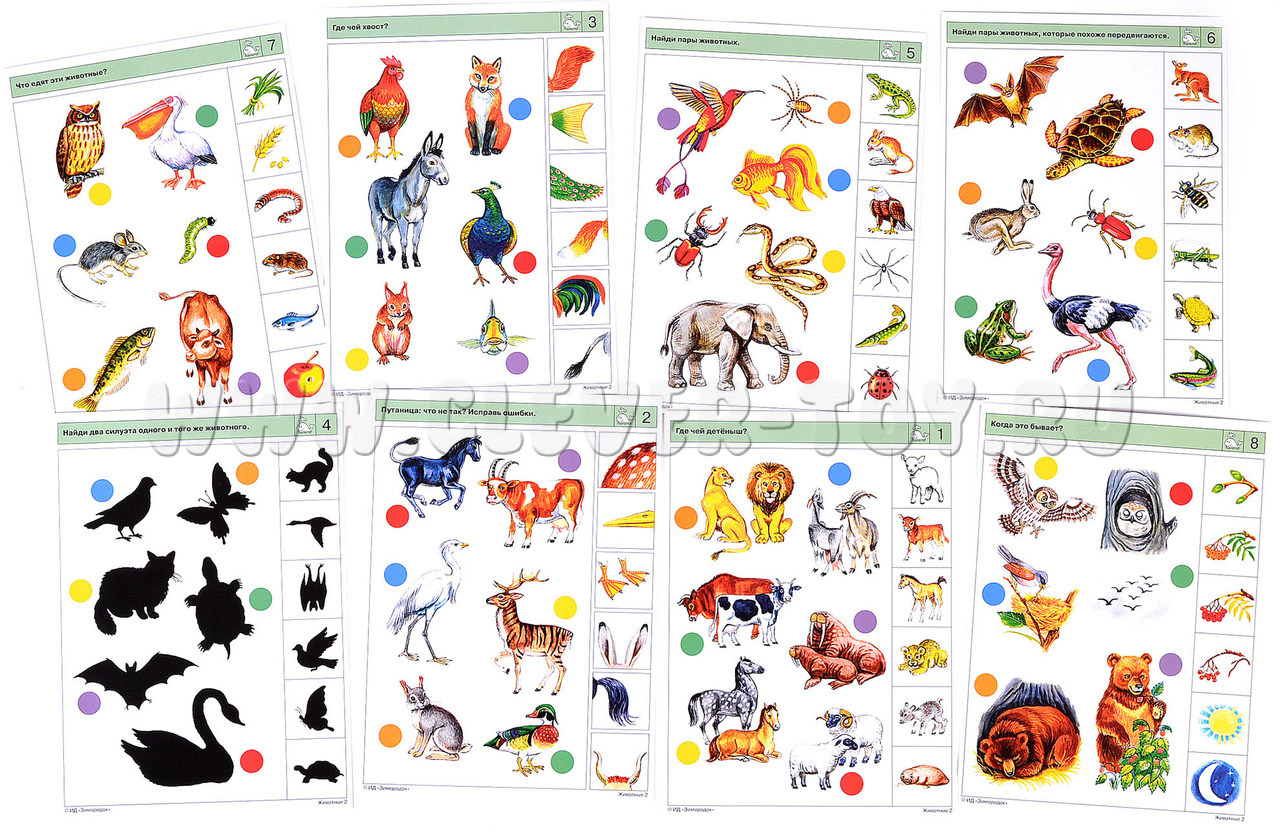 Основное назначение комплекта – ознакомление ребёнка с разнообразным миром животных. В процессе решения заданий, ребенок будет не только узнавать и называть новых и хорошо ему известных представителей животного мира, но и подбирать для них жилища, «одежду», питание, среду обитания, следы. Кроме того он будет определять к какой группе относятся те или иные представители животных (млекопитающие или звери, птицы, насекомые, рыбы, пресмыкающиеся и др.), опираясь в своем выборе на общие признаки отдельных видов. Другие темы карточек: пары взрослые животные и их детеныши; этапы развития; способы передвижения; взаимодействие с человеком. Задания по теме равномерно распределены на два комплекта карточек Животные (1) и Животные (2), и не повторяются. Примеры заданий в карточках: 1а. Где чей детёныш? 2б. Сравни у этих животных части тела и окраску. 3а. Где чей хвост? 6б. Какие из этих животных скачут, бегают, летают, прыгают, ползают, плавают? 7б. Где и как животные добывают пищу?