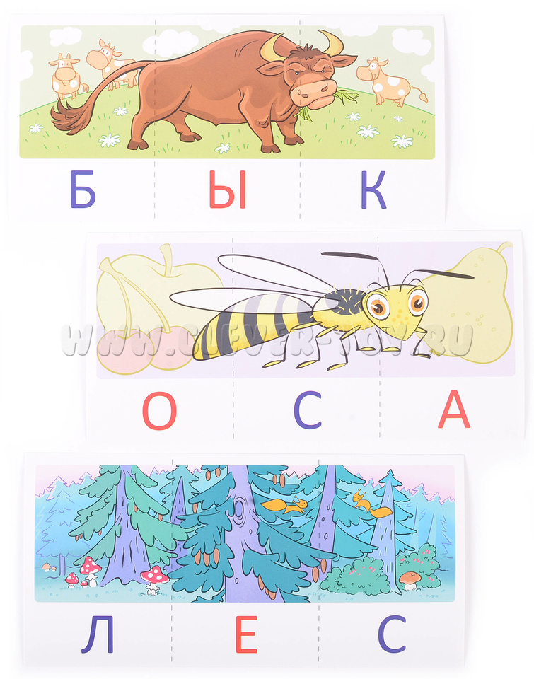 Издание, предназначенное для обучения детей 4-7 лет чтению, представляет собой комплект из 12 обучающих картинок, включающих 36 карточек и 12 слов.