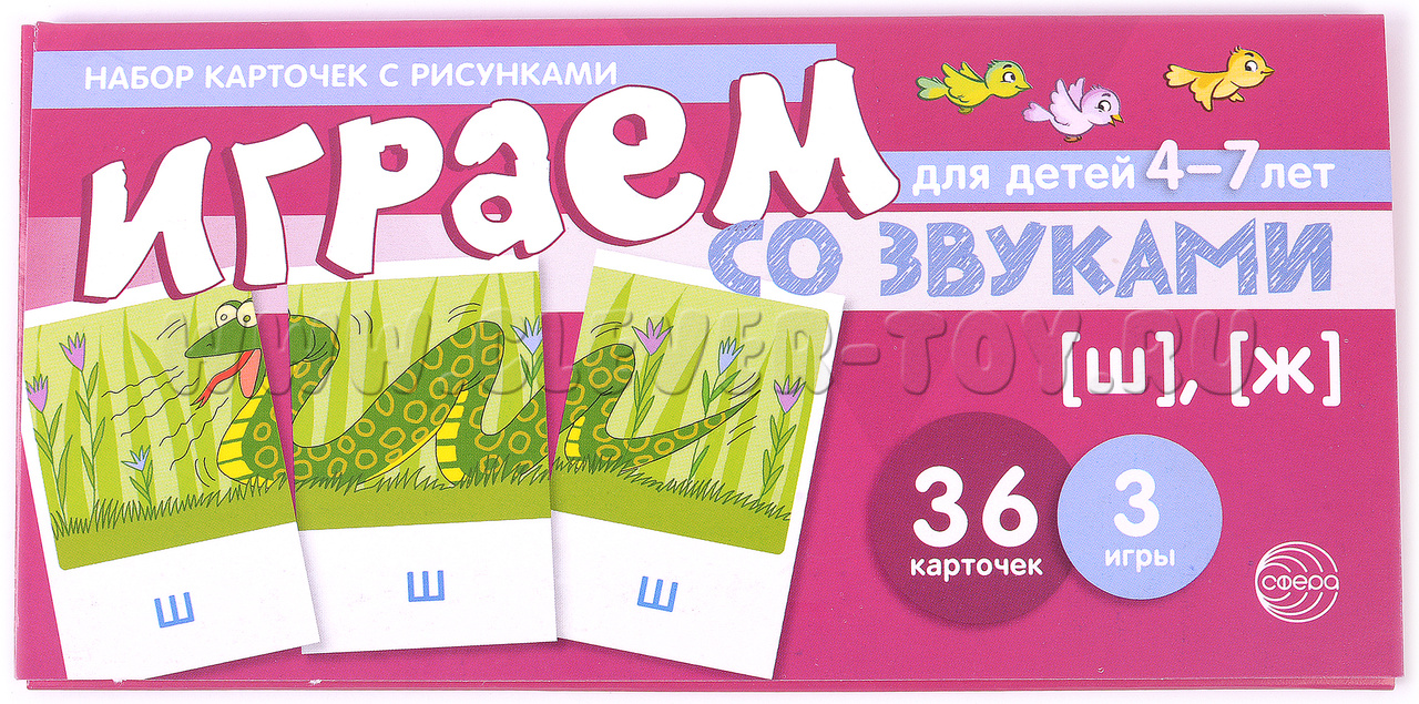 В комплекте 12 обучающих карточек, разделённых на 36 карточек и 3 игры. Ребёнок в игровой форме познакомится с шипящими звуками [ш] и [ж], научится их правильно произносить, сделает гимнастику для языка и выполнит артикуляционные упражнения.