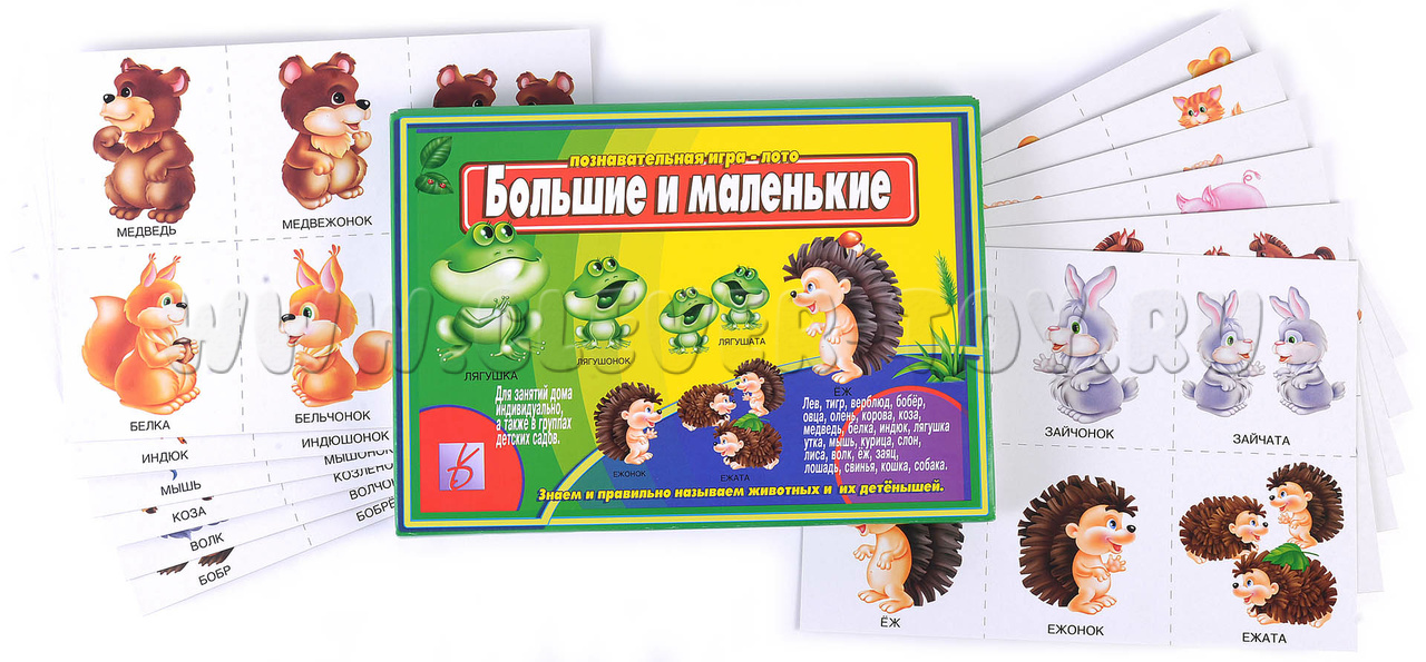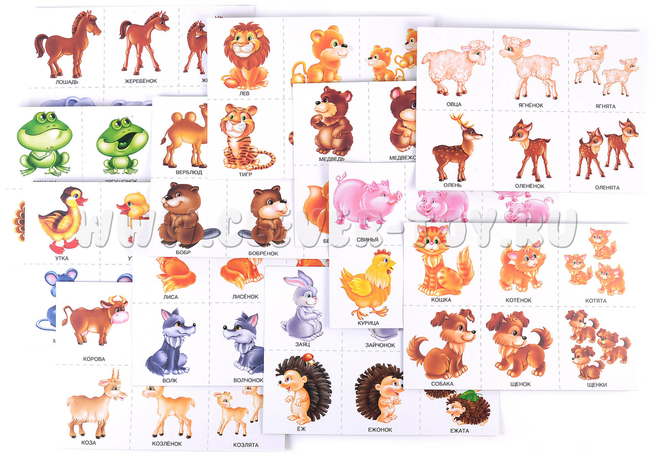 Перед началом игры нужно разрезать карты по пунктирным линиям (получится 72 карточки). Детям раздаются карточки со взрослыми животными, затем ведущий показывает изображения детенышей, а ребята подбирают соответствующие карточки.