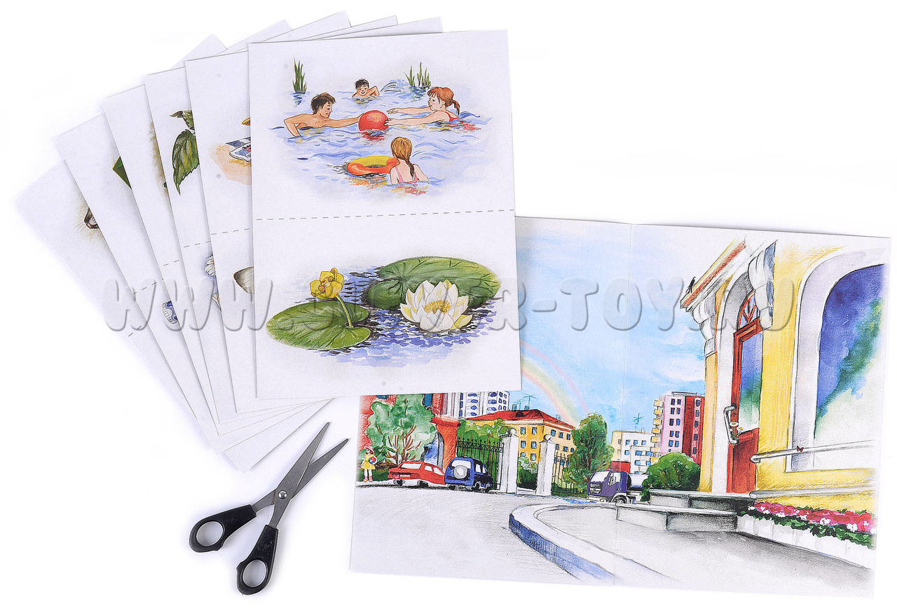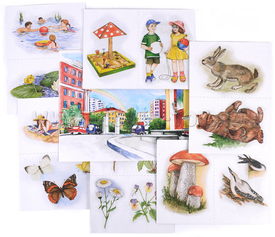 - предметные картинки с признаками лета - 12 шт. (6 разрезных листов А4);